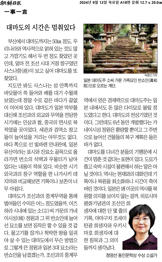 ① 부산에서 대마도까지는 50km 정도. 우리나라와 역사적으로 얽혀 있는 것도 많고 가깝기도 해서 두 번 정도 찾았던 곳인데, 얼마 전 조선시대 거점 항구였던 사스나항(港)이 보고 싶어 대마도를 또 찾았다.