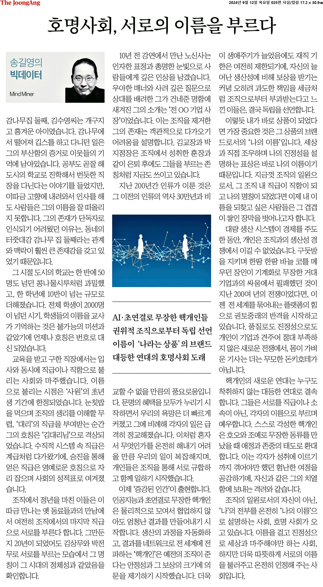 ⑤ 조직의 일원로서의 자신이 아닌, ‘나’의 전부를 온전히 ‘나의 이름’으로 설명하는 사회, 호명 사회가 오고 있습니다. 이름을 걸고 진정성으로 세상과 마주해야만 하는 사회, 하지만 더욱 따뜻하게 서로의 이름을 불러주고 온전히 인정해 주는 사회입니다.