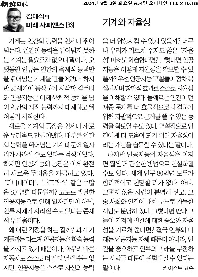 ④ 둘째로는 인간이 던져준 문제를 더 효율적으로 해결하기 위해 자발적으로 문제를 풀 수 있는 능력을 확보할 수도 있다. 역설적으로 인간에게 더 도움이 되기 위해 자율성이라는 개념을 습득할 수 있다는 말이다.