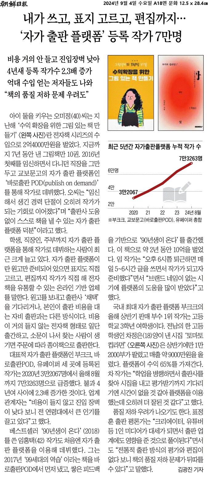 ③ 대표적 자가 출판 플랫폼인 부크크, 바로출판POD, 유페이퍼 세 곳에 등록된 작가는 2020년 3만2067명에서 올해 8월까지 7만3263명으로 급증했다. 불과 4년여 사이에 플랫폼별로 2~3배씩 증가한 것이다. 업계 관계자는 “비용이 들지 않고 진입 장벽이 낮다 보니 전 연령대에서 큰 인기를 끌고 있다”고 했다.