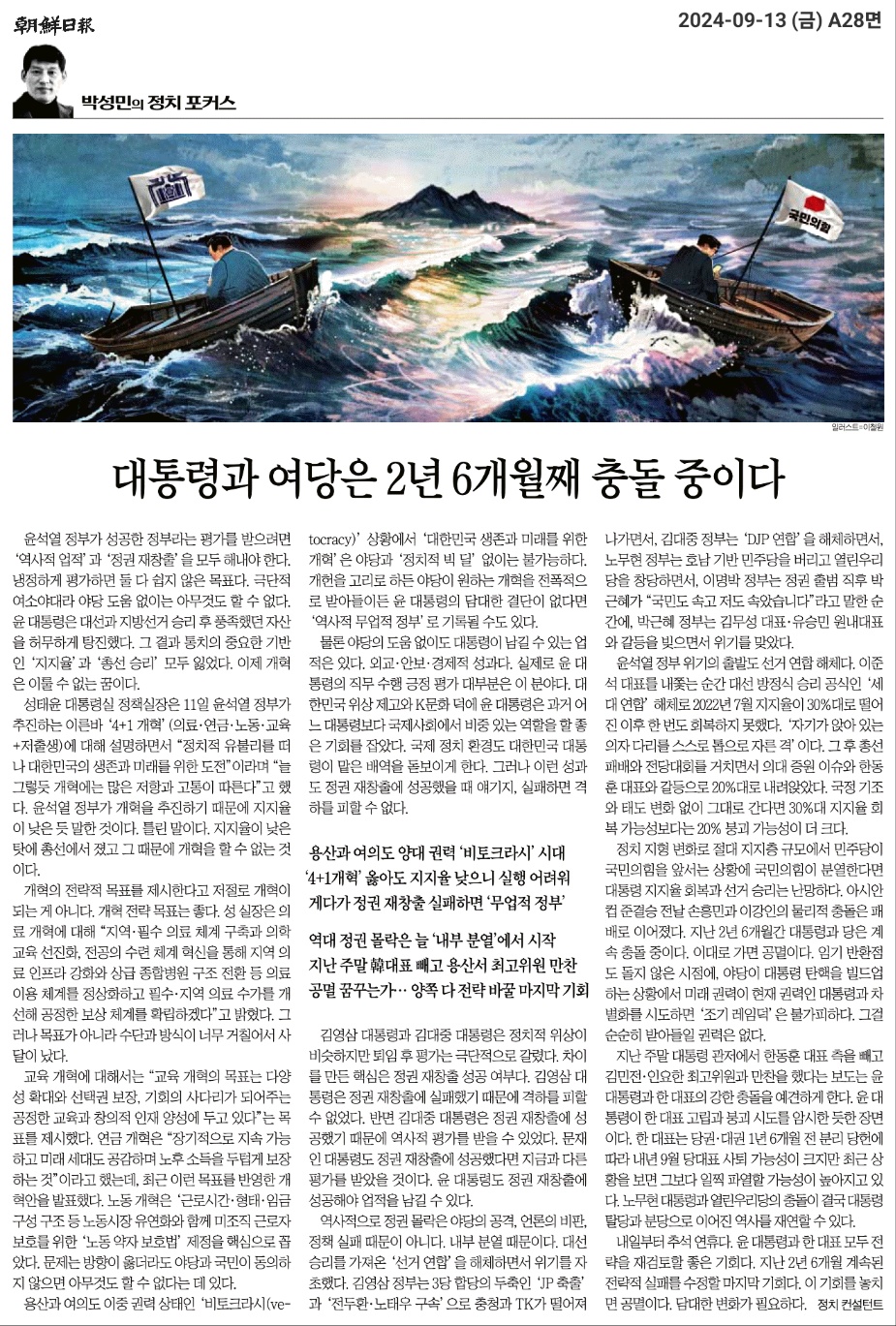 ③ 용산과 여의도 이중 권력 상태인 ‘비토크라시(vetocracy)’ 상황에서 ‘대한민국 생존과 미래를 위한 개혁’은 야당과 ‘정치적 빅 딜’ 없이는 불가능하다. 개헌을 고리로 하든 야당이 원하는 개혁을 전폭적으로 받아들이든 윤 대통령의 담대한 결단이 없다면 ‘역사적 무업적 정부’로 기록될 수도 있다.