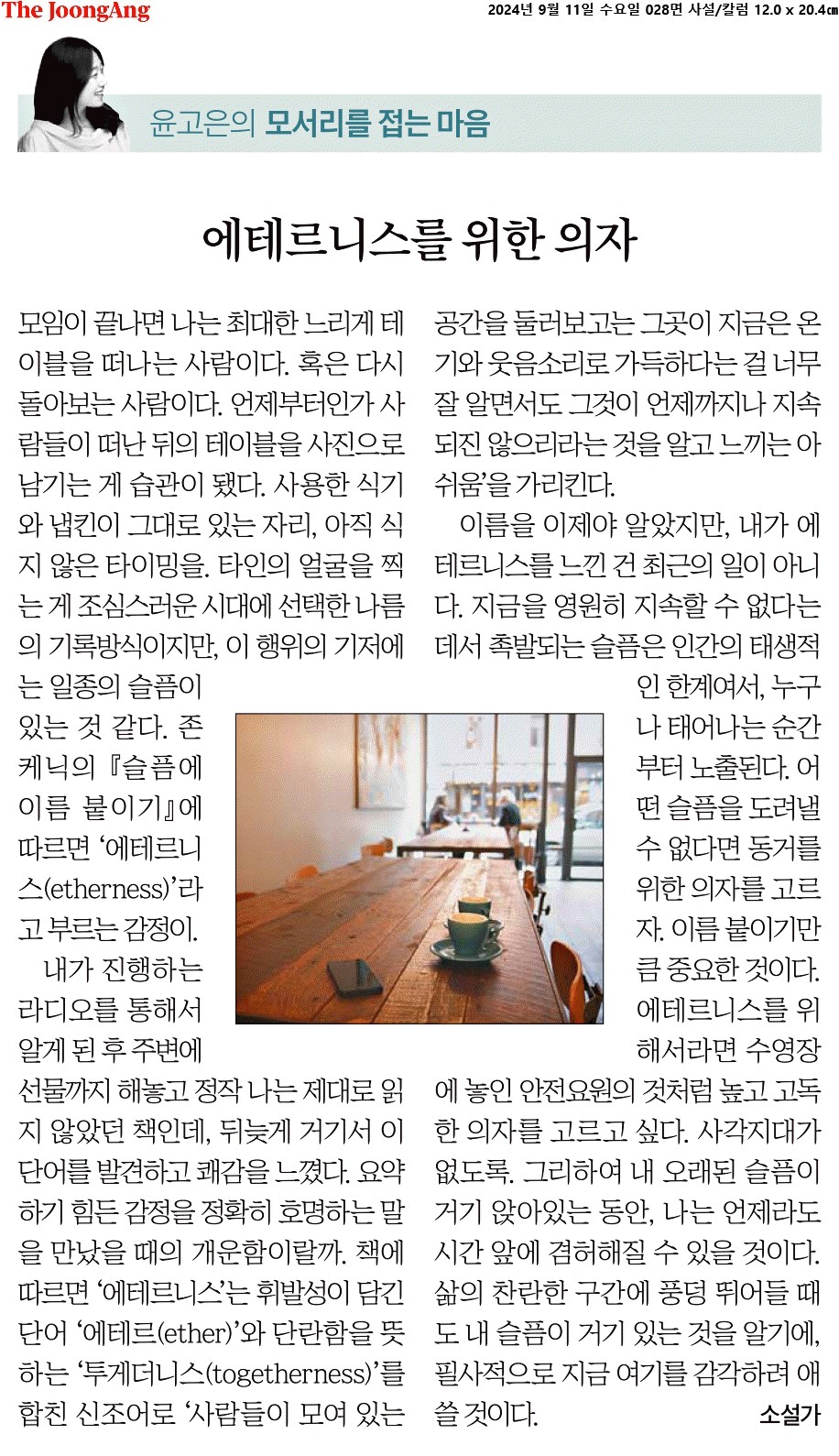 ④ 책에 따르면 ‘에테르니스’는 휘발성이 담긴 단어 ‘에테르(ether)’와 단란함을 뜻하는 ‘투게더니스(togetherness)’를 합친 신조어로 ‘사람들이 모여 있는 공간을 둘러보고는 그곳이 지금은 온기와 웃음소리로 가득하다는 걸 너무 잘 알면서도 그것이 언제까지나 지속되진 않으리라는 것을 알고 느끼는 아쉬움’을 가리킨다.
