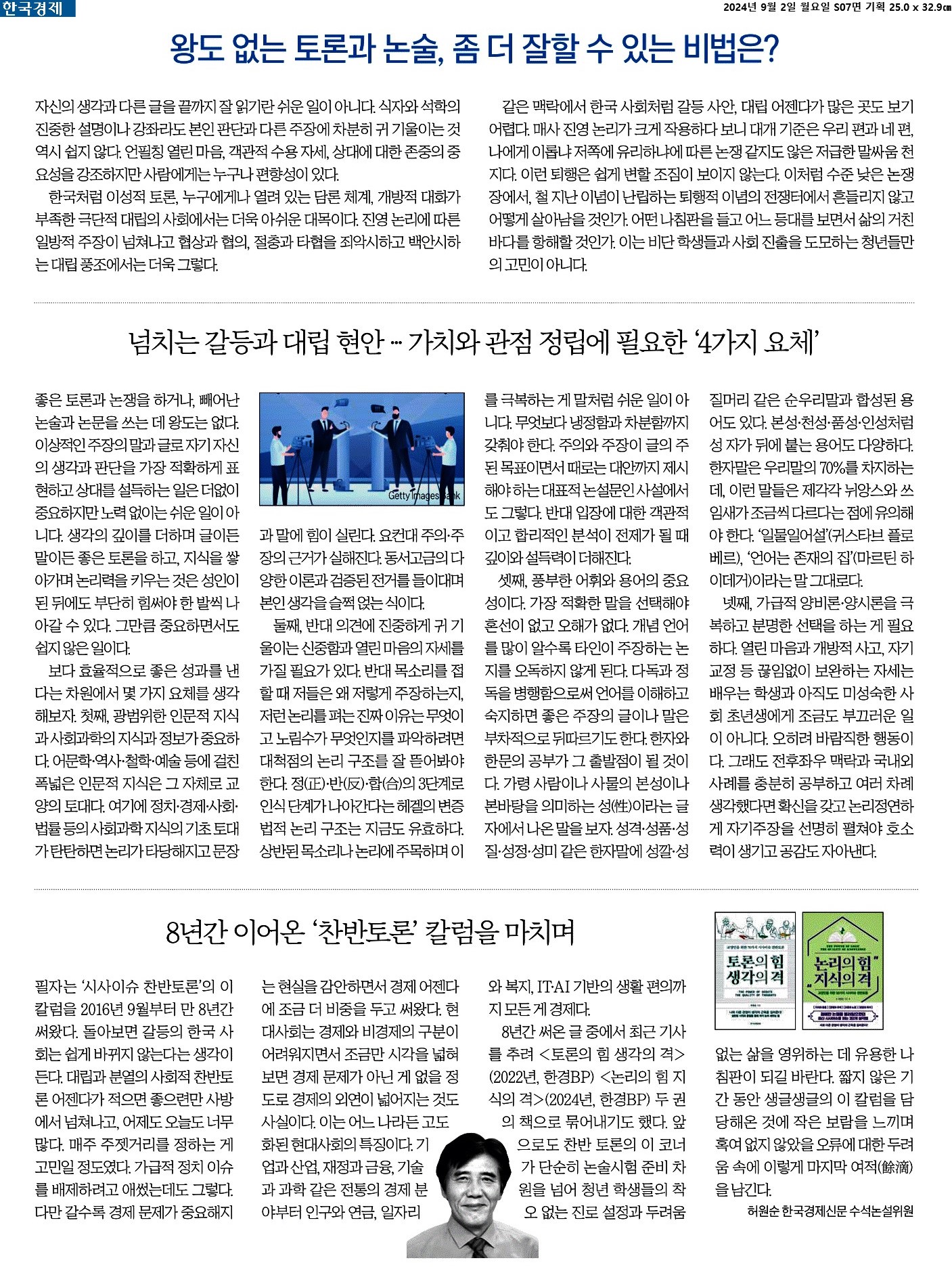 ① 생각의 깊이를 더하며 글이든 말이든 좋은 토론을 하고, 지식을 쌓아가며 논리력을 키우는 것은 성인이 된 뒤에도 부단히 힘써야 한 발씩 나아갈 수 있다. 그만큼 중요하면서도 쉽지 않은 일이다.