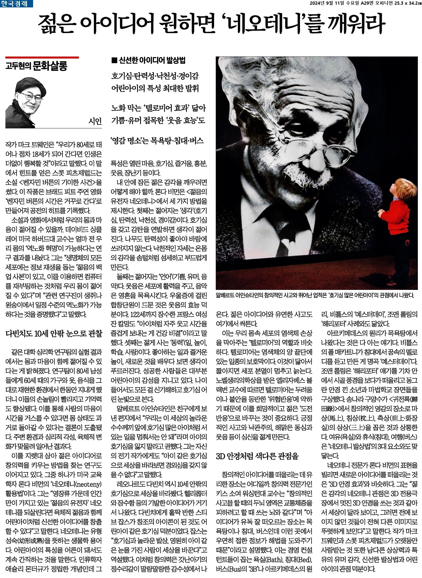 ④ 그중 하나가 미국 교육학자 론다 비먼의 ‘네오테니(neoteny) 활용법’이다. 그는 “영장류 가운데 인간만이 가지고 있는 ‘젊음의 유전자’ 네오테니를 되살린다면 육체적 젊음과 함께 어린아이처럼 신선한 아이디어를 창출할 수 있다”고 말한다. 인류학자 애슐리 몬터규가 정립한 개념인데 그 특성은 열린 마음, 호기심, 즐거움, 흥분, 웃음, 장난기 등이다.
