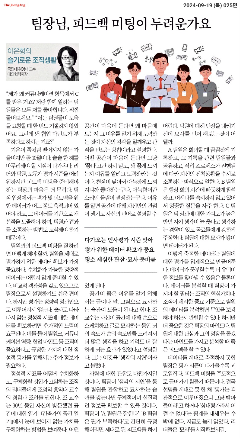 ① 리더와 팀원, 모두가 평가 시즌을 어려워하지만 피드백 미팅을 준비해야 하는 팀장의 마음은 더 무겁다. 팀장 입장에서는 평가 및 피드백을 위한 데이터가 어느 정도 축적되어 있어야 하고, 그 데이터를 기반으로 개선점을 도출해야 하며, 팀원과 결과를 소통하는 방법도 고심해야 하기 때문이다.