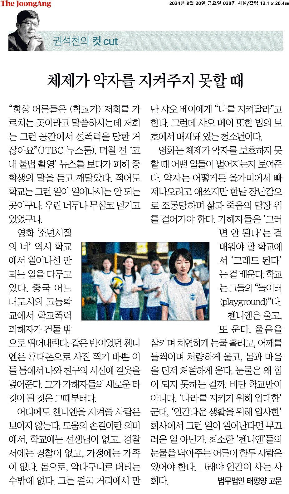 ① 영화 ‘소년시절의 너’ 역시 학교에서 일어나선 안 되는 일을 다루고 있다. 중국 어느 대도시의 고등학교에서 학교폭력 피해자가 건물 밖으로 뛰어내린다. 같은 반이었던 첸니엔은 휴대폰으로 사진 찍기 바쁜 이들 틈에서 나와 친구의 시신에 겉옷을 덮어준다. 그가 가해자들의 새로운 타깃이 된 것은 그때부터다.