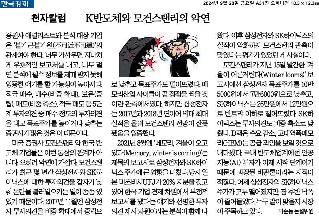 ② 미국 증권사 모건스탠리와 한국 반도체 기업들은 이런 통상의 관계가 아니다. 오히려 악연에 가깝다. 모건스탠리가 최근 몇 년간 삼성전자와 SK하이닉스에 대한 투자의견을 갑자기 낮춰 논란을 불러일으키는 일이 종종 있었기 때문이다.