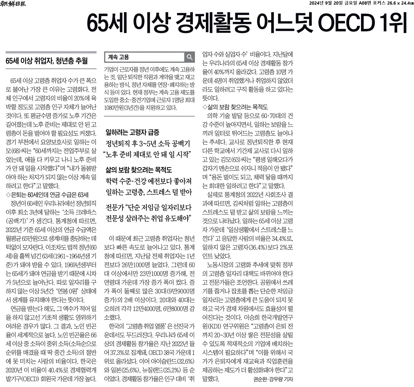 ④ 한국의 ‘고령층 취업 열풍’은 선진국 가운데서도 두드러진다. 우리나라 65세 이상의 경제활동 참가율은 지난 2022년 들어 37.3%로 집계돼, OECD 38국 가운데 1위로 올라섰다. 이어 아이슬란드(32.6%)와 일본(25.6%), 뉴질랜드(25.2%) 등 순이었다.