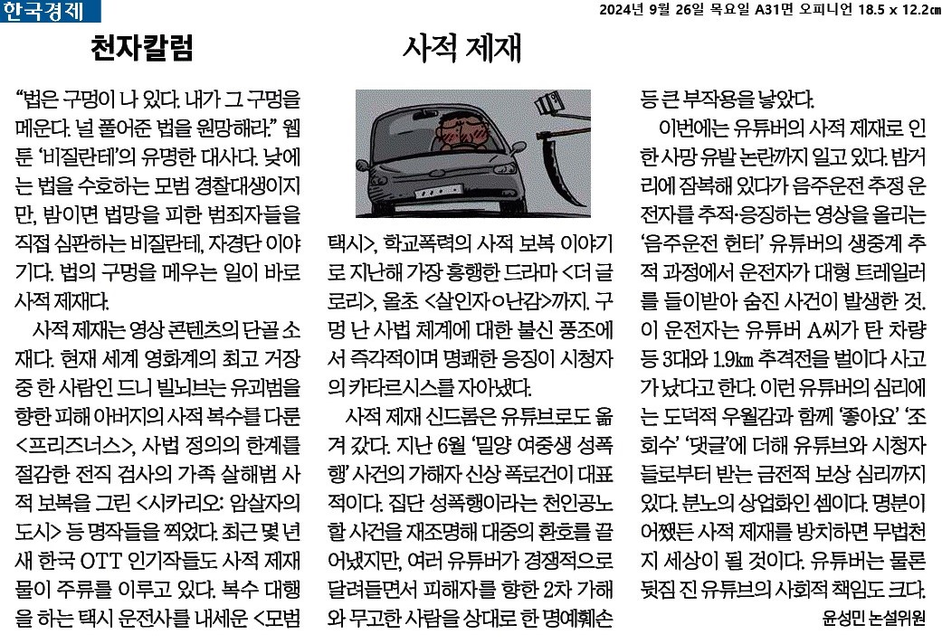 ⑤ 명분이 어쨌든 사적 제재를 방치하면 무법천지 세상이 될 것이다. 유튜버는 물론 뒷짐 진 유튜브의 사회적 책임도 크다.