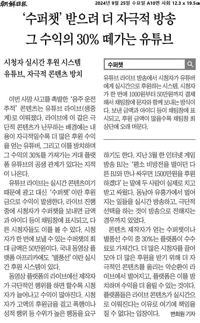 ① 라이브에 이 같은 극단적 콘텐츠가 난무하는 배경에는 내용이 자극적일수록 더 많은 후원 수익을 얻는 유튜버, 그리고 이를 방치하며 그 수익의 30%를 가져가는 거대 플랫폼 유튜브의 공생 관계가 있다는 지적이 나온다.