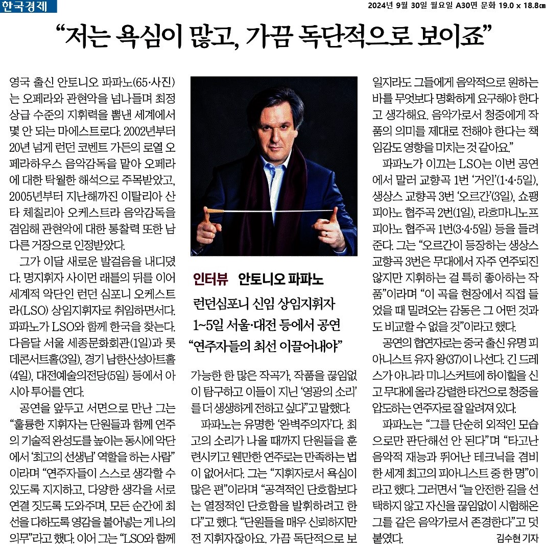 ① 영국 출신 안토니오 파파노(65·사진)는 오페라와 관현악을 넘나들며 최정상급 수준의 지휘력을 뽐낸 세계에서 몇 안 되는 마에스트로다.