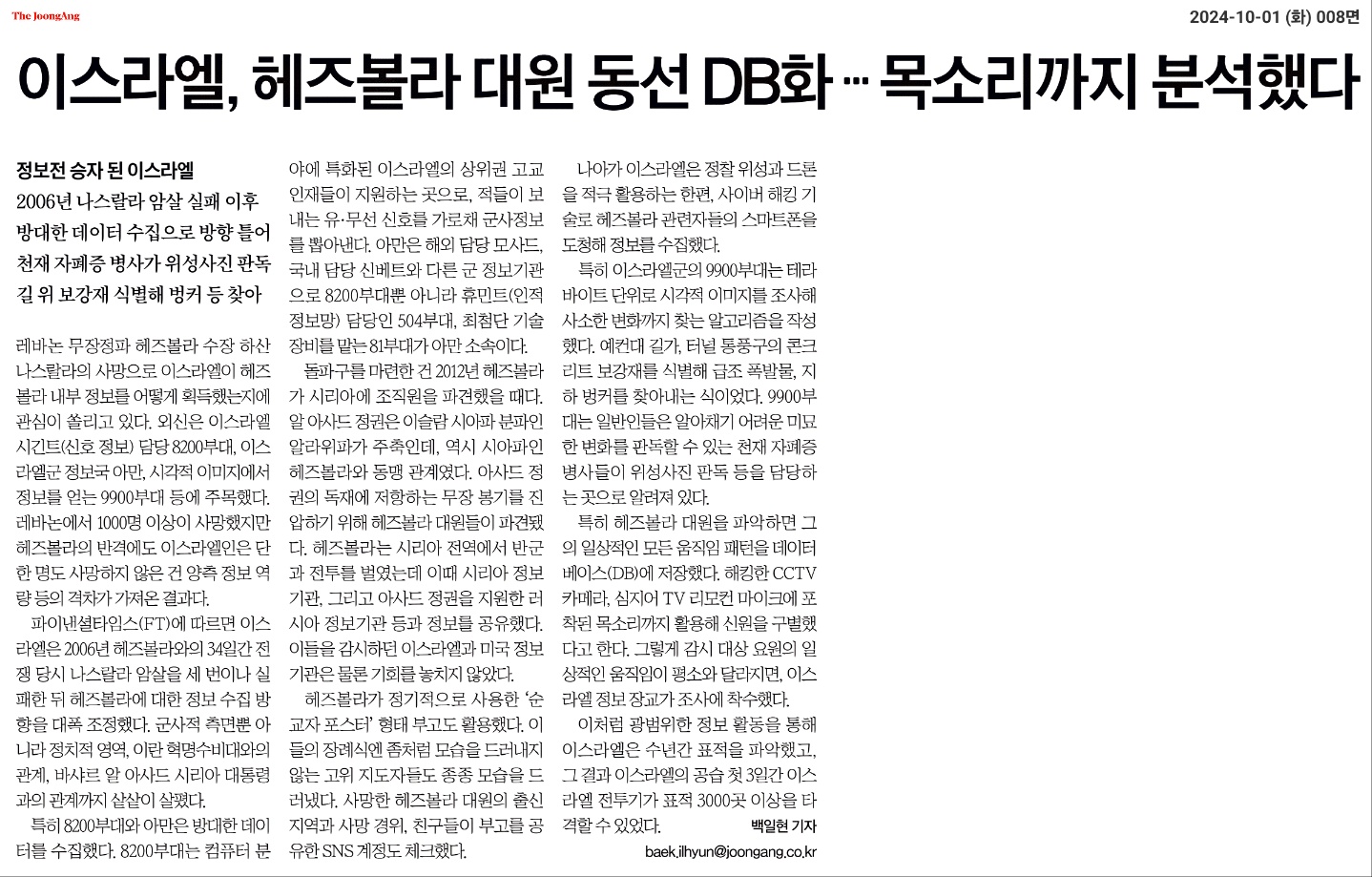 ① 레바논 무장정파 헤즈볼라 수장 하산 나스랄라의 사망으로 이스라엘이 헤즈볼라 내부 정보를 어떻게 획득했는지에 관심이 쏠리고 있다. 외신은 이스라엘 시긴트(신호 정보) 담당 8200부대, 이스라엘군 정보국 아만, 시각적 이미지에서 정보를 얻는 9900부대 등에 주목했다. 레바논에서 1000명 이상이 사망했지만 헤즈볼라의 반격에도 이스라엘인은 단 한 명도 사망하지 않은 건 양측 정보 역량 등의 격차가 가져온 결과다.