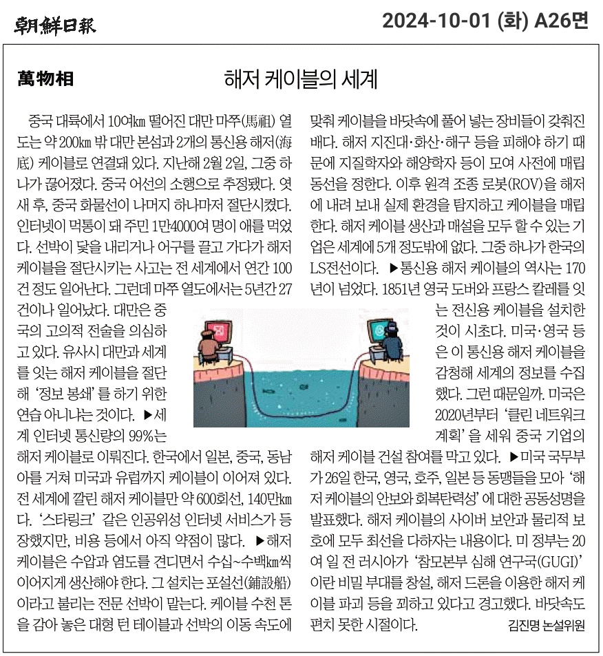 ⑤ 미 정부는 20여 일 전 러시아가 ‘참모본부 심해 연구국(GUGI)’이란 비밀 부대를 창설, 해저 드론을 이용한 해저 케이블 파괴 등을 꾀하고 있다고 경고했다. 바닷속도 편치 못한 시절이다.