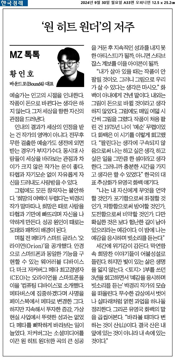③ 그럼에도 모든 창작자는 불안하다. ‘희망의 여백이 두렵다’는 박경리 작가 말마따나, 희망은 때로 사람을 타협과 기만에 빠뜨리며 자신을 나약하게 만든다. 성공 원인이 때로는 도태와 패착의 배경이 된다.