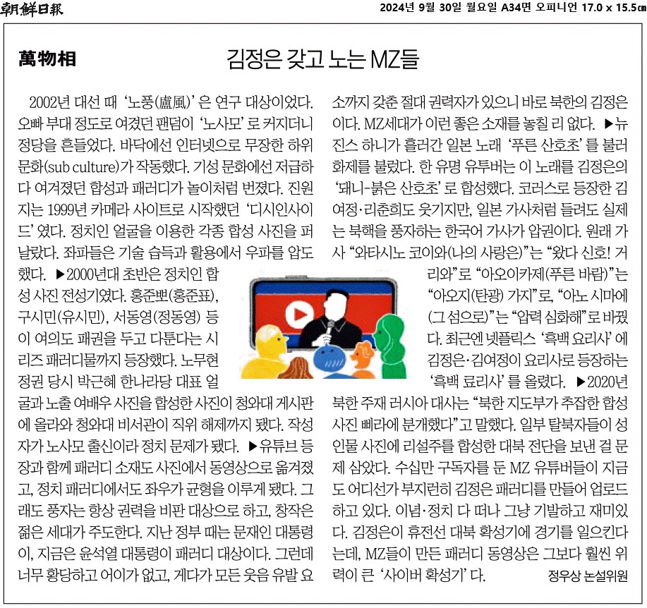 ⑤ 김정은이 휴전선 대북 확성기에 경기를 일으킨다는데, MZ들이 만든 패러디 동영상은 그보다 훨씬 위력이 큰 ‘사이버 확성기’다.