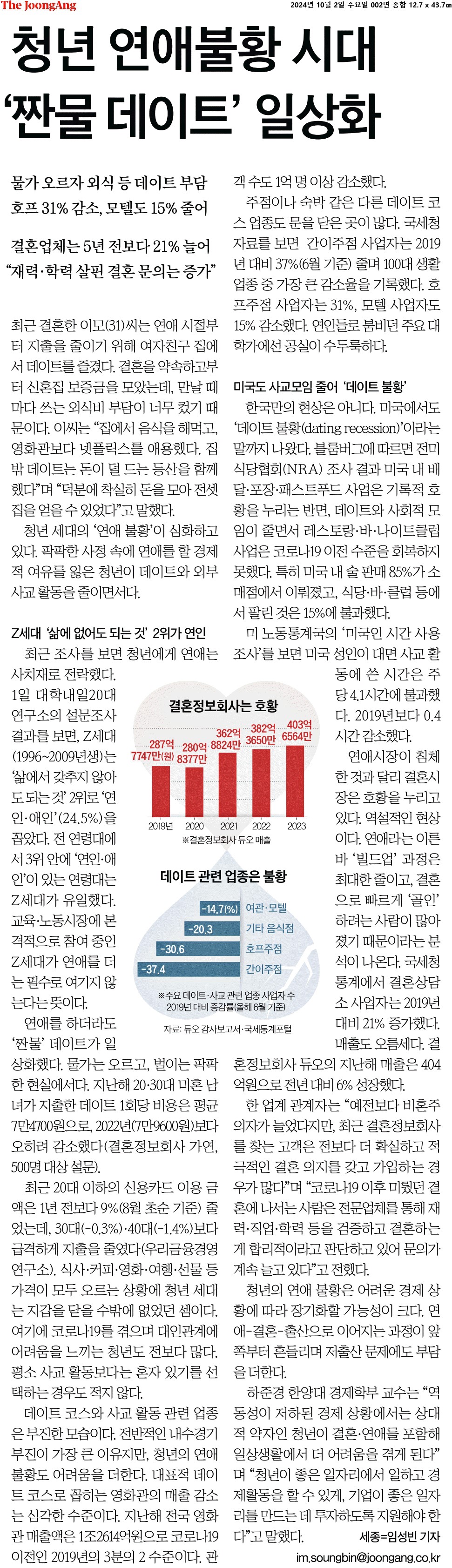 ② 연애를 하더라도 '짠물' 데이트가 일상화했다. 물가는 오르고, 벌이는 팍팍한 현실에서다.