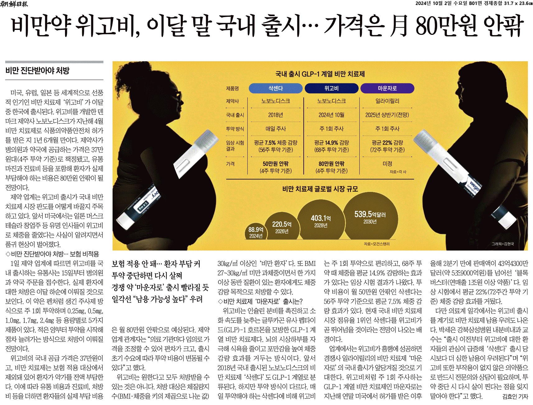 ② 제약 업계는 위고비 출시가 국내 비만 치료제 시장 판도를 어떻게 바꿀지 주목하고 있다. 앞서 미국에서는 일론 머스크 테슬라 창업주 등 유명 인사들이 위고비로 체중을 줄였다는 사실이 알려지면서 품귀 현상이 벌어졌다.