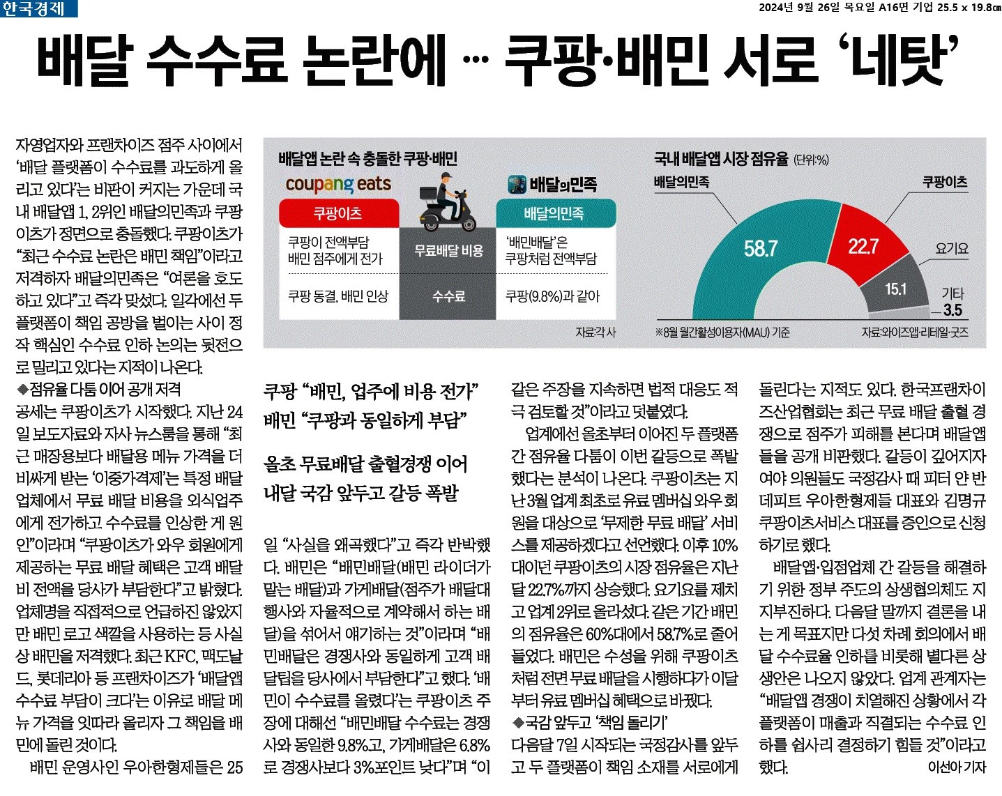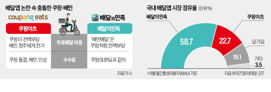 ③ “배민배달(배민 라이더가 맡는 배달)과 가게배달(점주가 배달대행사와 자율적으로 계약해서 하는 배달)을 섞어서 얘기하는 것”이라며 “배민배달은 경쟁사와 동일하게 고객 배달팁을 당사에서 부담한다”고 했다. ‘배민이 수수료를 올렸다’는 쿠팡이츠 주장에 대해선 “배민배달 수수료는 경쟁사와 동일한 9.8%고, 가게배달은 6.8%로 경쟁사보다 3%포인트 낮다”며 “이 같은 주장을 지속하면 법적 대응도 적극 검토할 것”