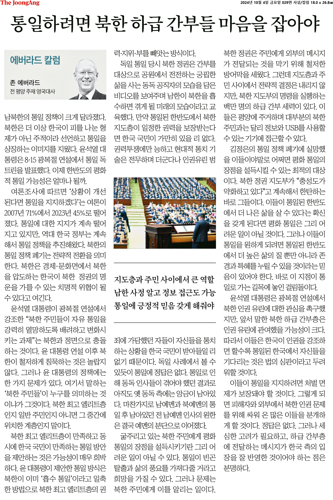 ⑤ 김정은의 통일 정책 폐기에 실망했을 이들이야말로 어쩌면 평화 통일의 장점을 설득시킬 수 있는 최적의 대상이다. 북한 정권 지도부가 “충성도가 약화하고 있다”고 계속해서 한탄하는 바로 그들이다. 이들이 통일된 한반도에서 더 나은 삶을 살 수 있다는 확신을 갖게 된다면 평화 통일은 그리 어려운 일이 아닐 것이다. 그러나 이들이 통일을 원하게 되려면 통일된 한반도에서 더 높은 삶의 질 뿐만 아니라 존경과 특혜를 누릴 수 있을 것이라는 믿음이 있어야 한다.