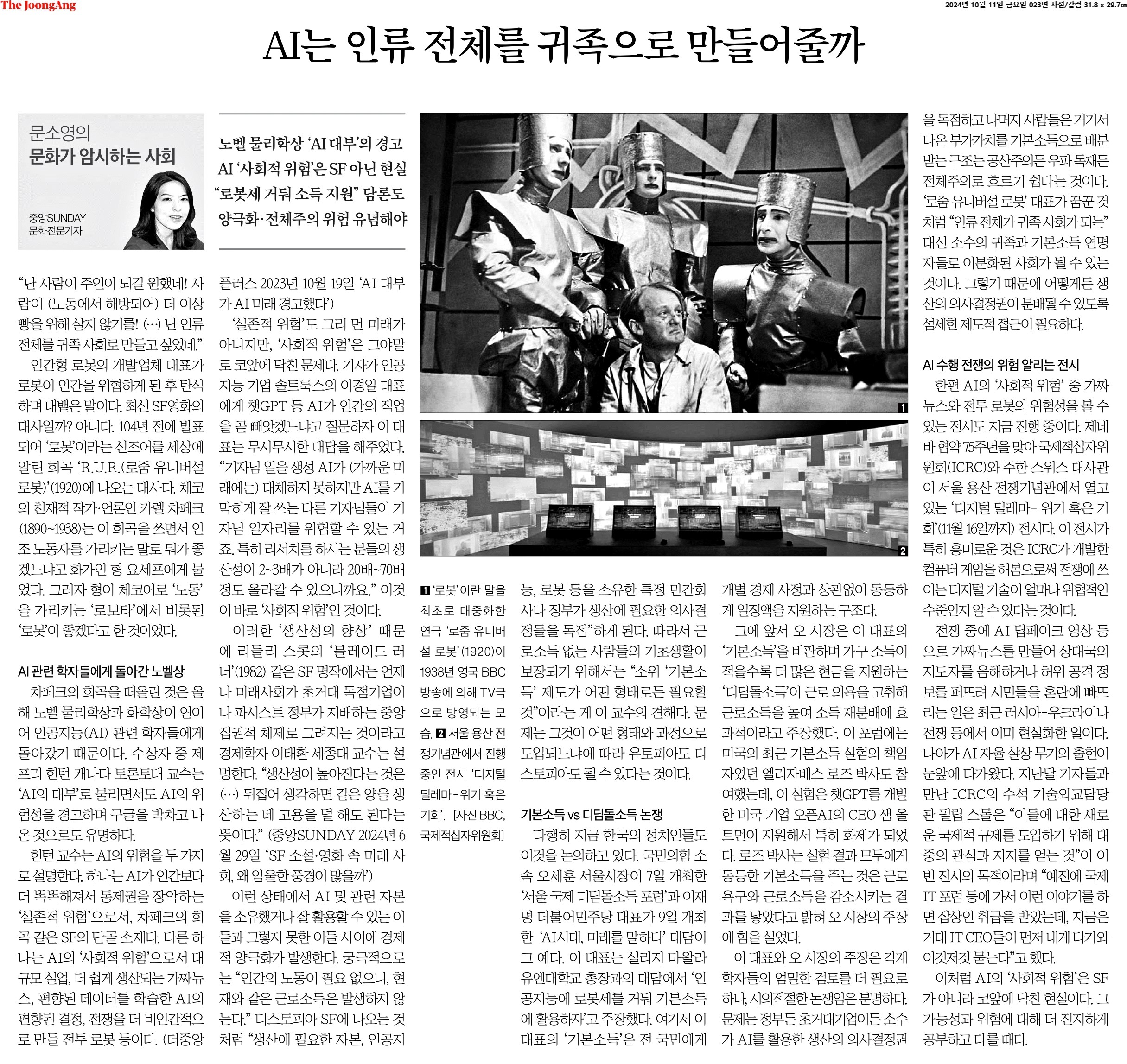 ③ 차페크의 희곡을 떠올린 것은 올해 노벨 물리학상과 화학상이 연이어 인공지능(AI) 관련 학자들에게 돌아갔기 때문이다. 수상자 중 제프리 힌턴 캐나다 토론토대 교수는 ‘AI의 대부’로 불리면서도 AI의 위험성을 경고하며 구글을 박차고 나온 것으로도 유명하다.