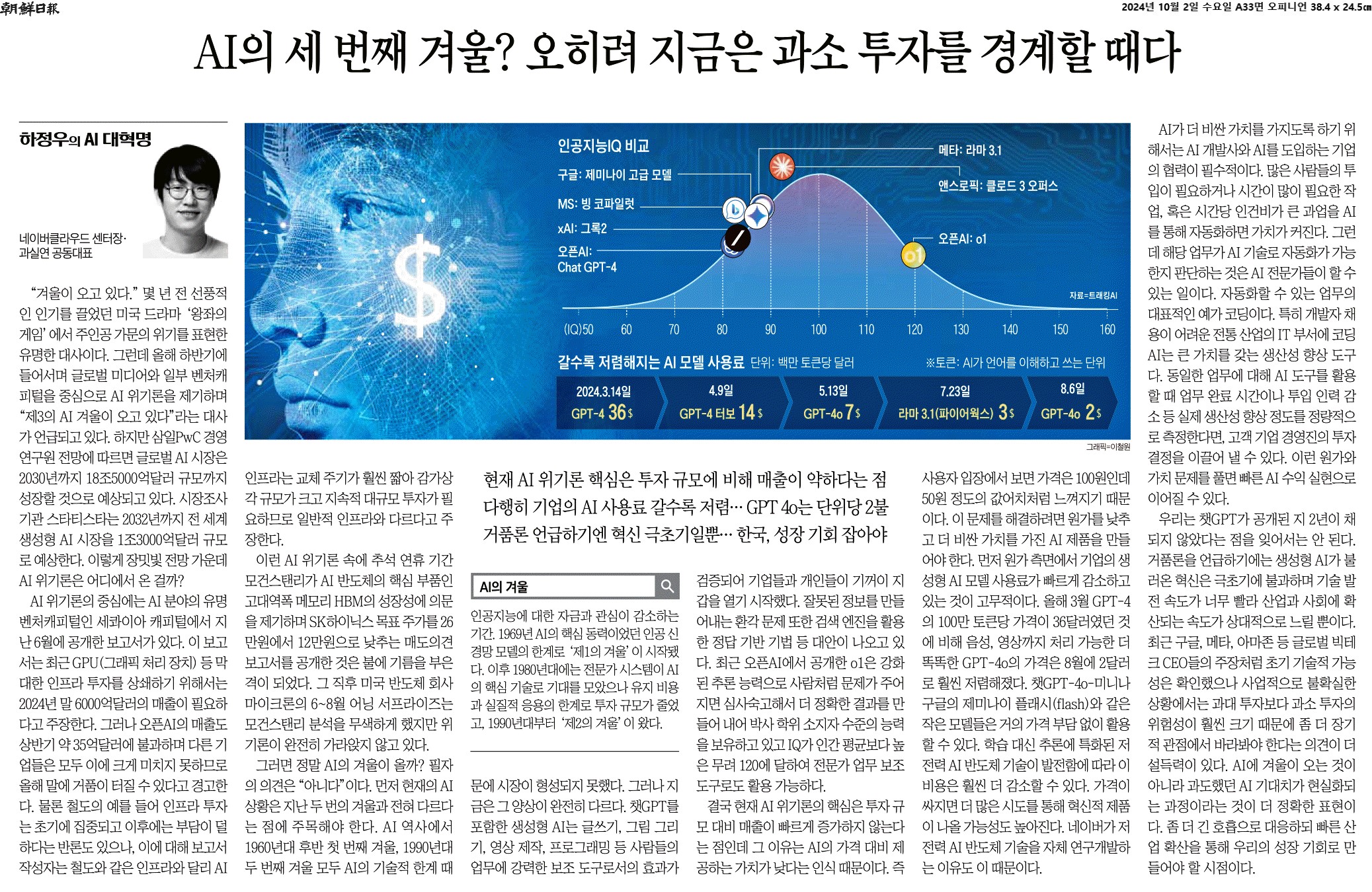 ① “겨울이 오고 있다.” 몇 년 전 선풍적인 인기를 끌었던 미국 드라마 ‘왕좌의 게임’에서 주인공 가문의 위기를 표현한 유명한 대사이다. 그런데 올해 하반기에 들어서며 글로벌 미디어와 일부 벤처캐피털을 중심으로 AI 위기론을 제기하며 “제3의 AI 겨울이 오고 있다”라는 대사가 언급되고 있다.