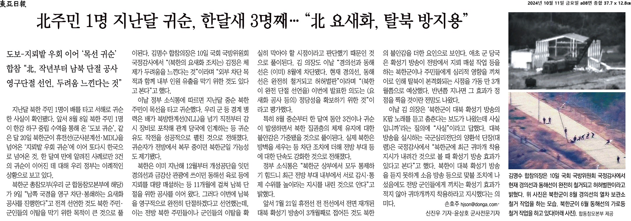 ② 김명수 합참의장은 10일 국회 국방위원회 국정감사에서 “(북한의 요새화 조치는) 김정은 체제가 두려움을 느낀다는 것”이라며 “외부 차단 목적과 함께 내부 인원 유출을 막기 위한 것도 있다고 본다”고 했다.