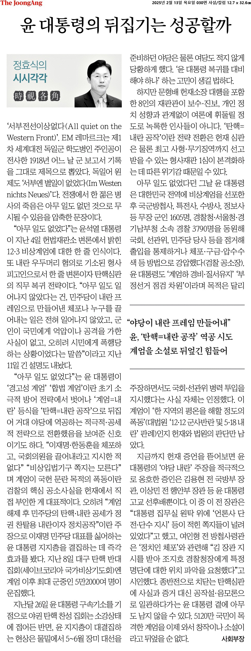 ⑤ 종반전으로 치닫는 탄핵심판에 사실과 증거 대신 공작설·음모론으로 일관하다가는 윤 대통령 곁에 아무도 남지 않을 수 있다. 5120만 국민이 목격한 계엄을 이제 와서 창작이나 소설이라고 뒤엎을 순 없다.
