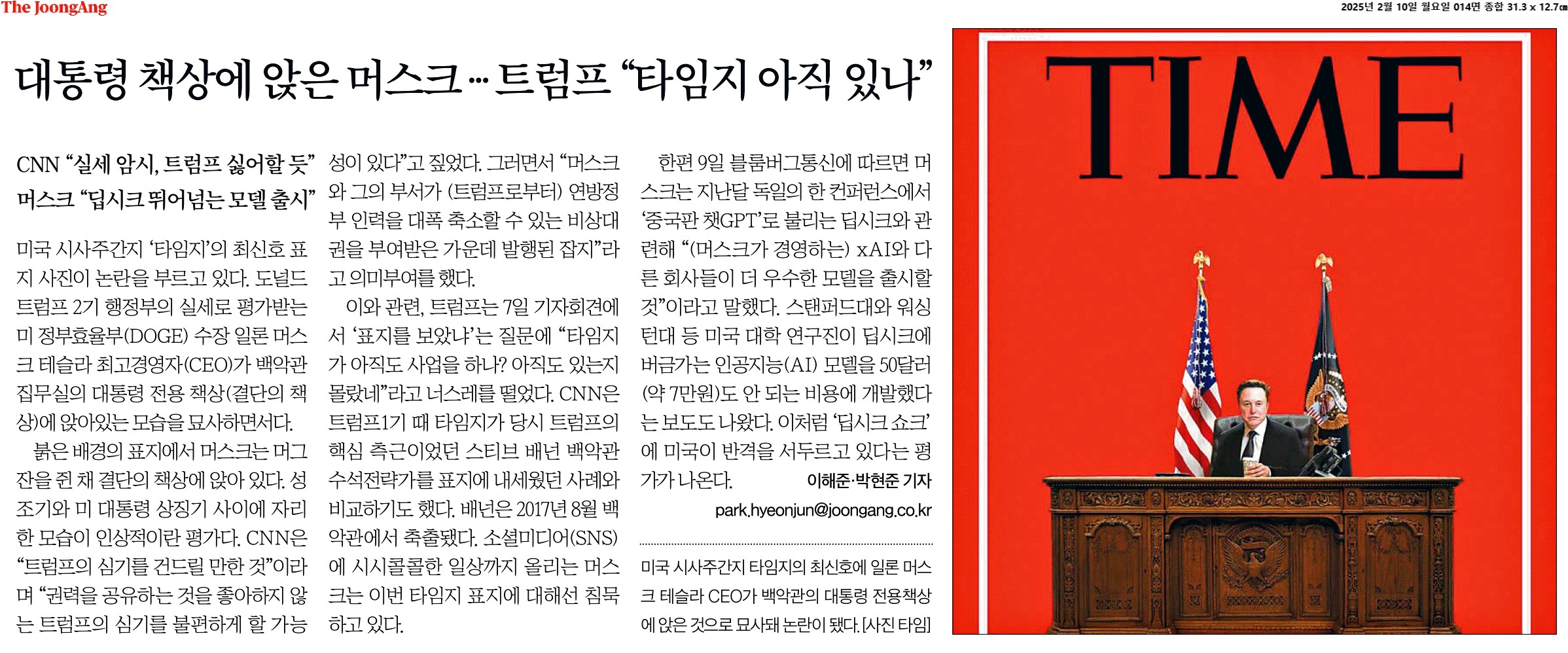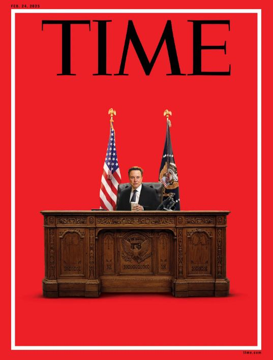 ① 미국 시사주간지 ‘타임지’의 최신호 표지 사진이 논란을 부르고 있다. 도널드 트럼프 2기 행정부의 실세로 평가받는 미 정부효율부(DOGE) 수장 일론 머스크 테슬라 최고경영자(CEO)가 백악관 집무실의 대통령 전용 책상(결단의 책상)에 앉아있는 모습을 묘사하면서다.