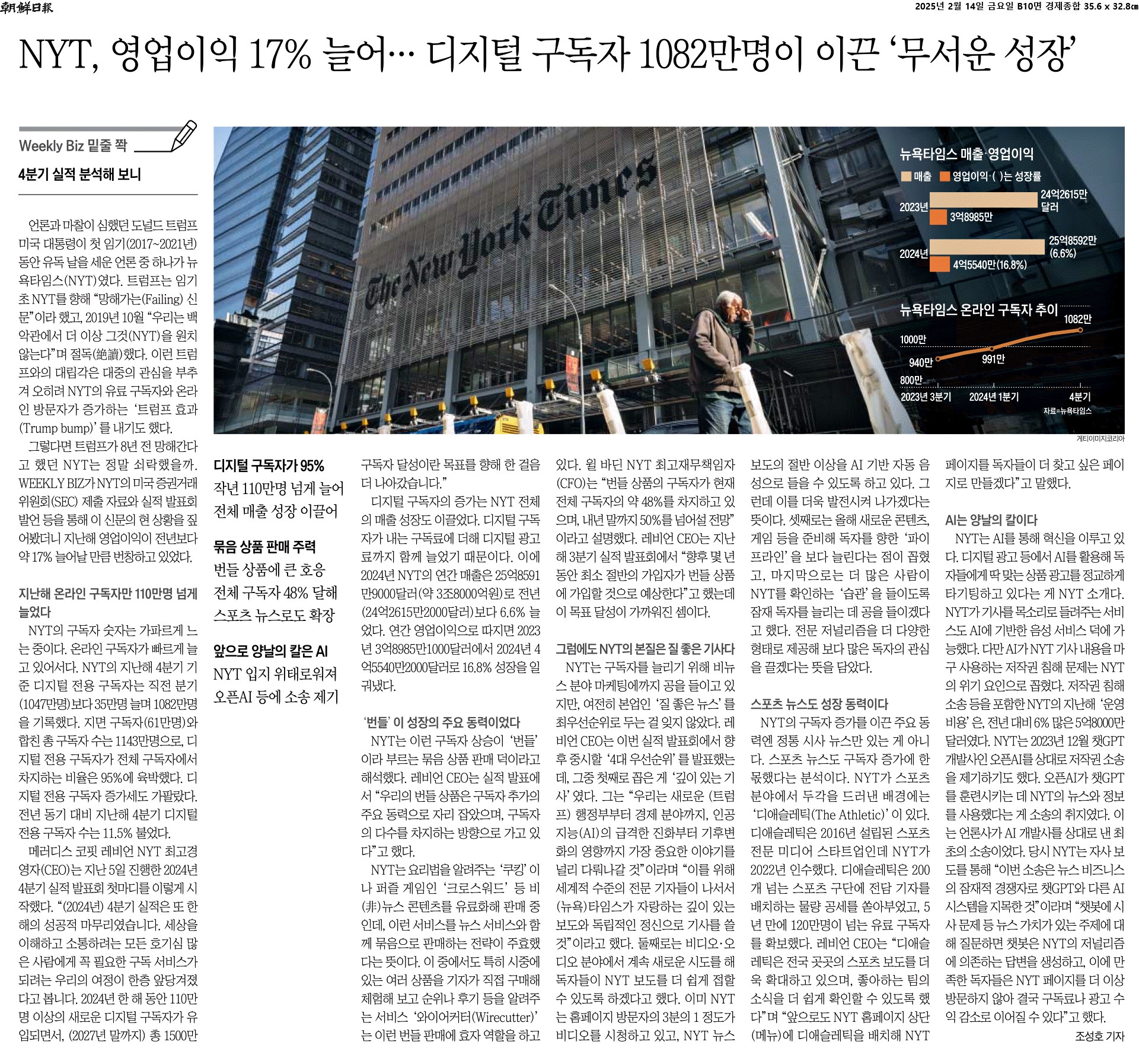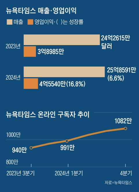 ④ 디지털 구독자의 증가는 NYT 전체의 매출 성장도 이끌었다. 디지털 구독자가 내는 구독료에 더해 디지털 광고료까지 함께 늘었기 때문이다. 이에 2024년 NYT의 연간 매출은 25억8591만9000달러(약 3조8000억원)로 전년(24억2615만2000달러)보다 6.6% 늘었다. 연간 영업이익으로 따지면 2023년 3억8985만1000달러에서 2024년 4억5540만2000달러로 16.8% 성장을 일궈냈다.
