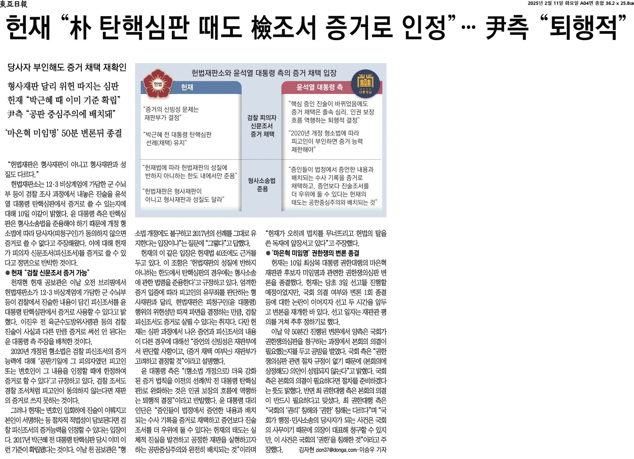 ② 윤 대통령 측은 탄핵심판은 형사소송법을 준용해야 하기 때문에 개정 형소법에 따라 당사자(피청구인)가 동의하지 않으면 증거로 쓸 수 없다고 주장해왔다. 이에 대해 헌재가 피의자 신문조서(피신조서)를 증거로 쓸 수 있다고 정면으로 반박한 것이다.
