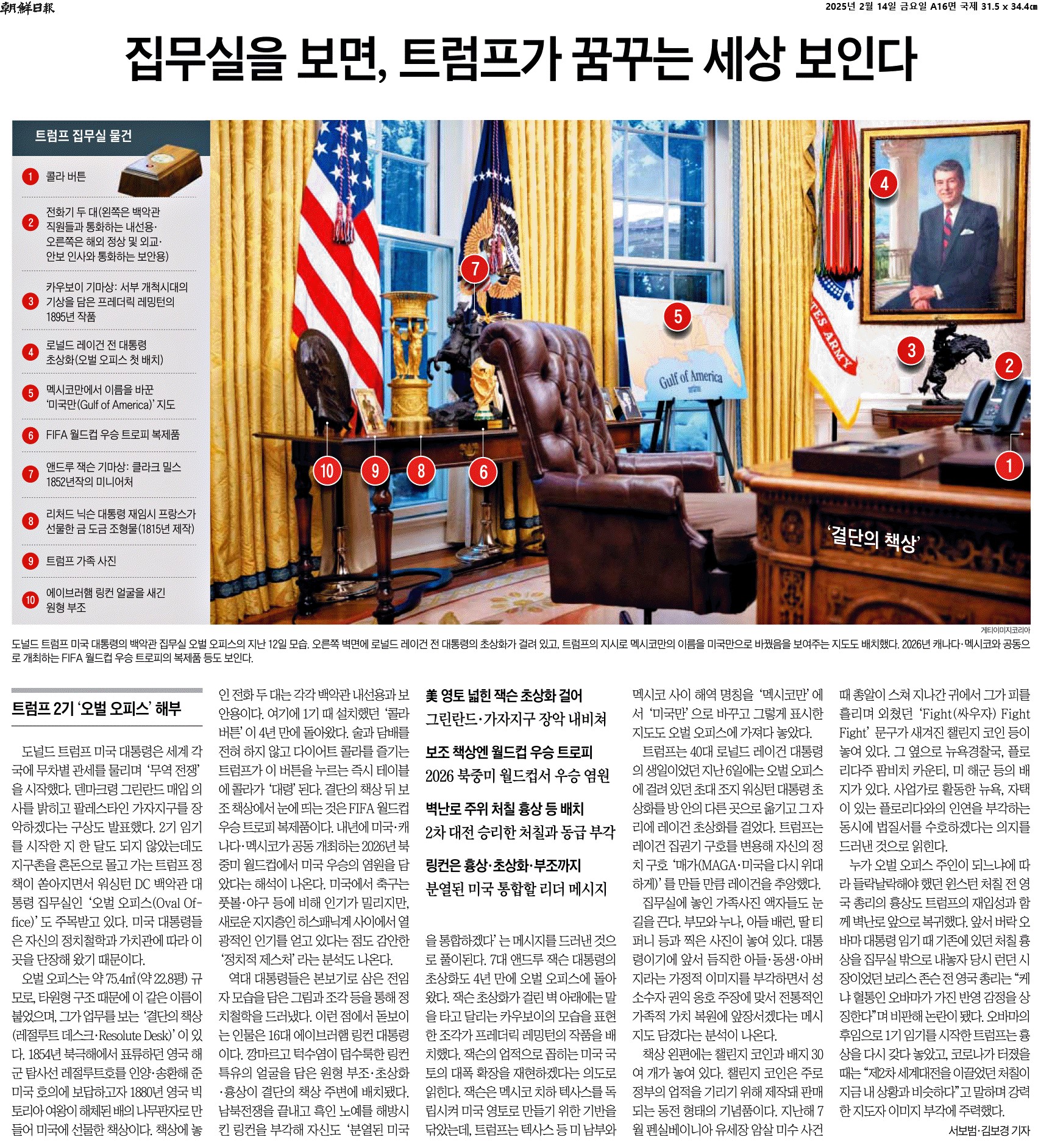 ① 도널드 트럼프 미국 대통령은 세계 각국에 무차별 관세를 물리며 ‘무역 전쟁’을 시작했다. 덴마크령 그린란드 매입 의사를 밝히고 팔레스타인 가자지구를 장악하겠다는 구상도 발표했다. 2기 임기를 시작한 지 한 달도 되지 않았는데도 지구촌을 혼돈으로 몰고 가는 트럼프 정책이 쏟아지면서 워싱턴 DC 백악관 대통령 집무실인 ‘오벌 오피스(Oval Office)’도 주목받고 있다. 미국 대통령들은 자신의 정치철학과 가치관에 따라 이곳을 단장해 왔기 때문이다.