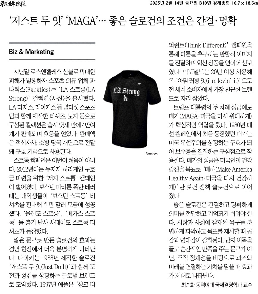 ① 지난달 로스앤젤레스 산불로 막대한 피해가 발생하자 스포츠 의류 업체 파나틱스(Fanatics)는 ‘LA 스트롱(LA Strong)’ 컬렉션을 출시했다. LA 다저스, 레이커스 등 열다섯 스포츠팀과 함께 제작한 티셔츠, 모자 등으로 구성된 컬렉션은 출시 닷새 만에 4만여 개가 판매되며 호응을 얻었다. 판매액은 적십자사, 소방 당국 재단으로 전달돼 구호 기금으로 사용된다.