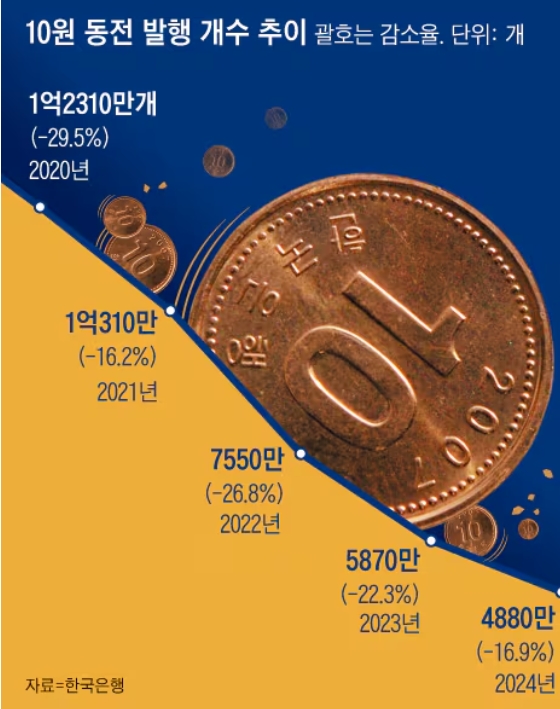 ③ 시중에 유통하기 위해 찍는 최소 화폐 단위는 ‘10원’이다. 발행량은 2020년부터 큰 폭으로 줄고 있다. 작년에는 전년보다 17% 줄어든, 4880만개를 발행했다. 10원뿐 아니라 50·100·500원 등 모든 동전 발행량이 줄었다. 작년 한은이 발행한 모든 동전의 액면가는 102억4200만원으로, 전년보다 24%가량 줄었다.