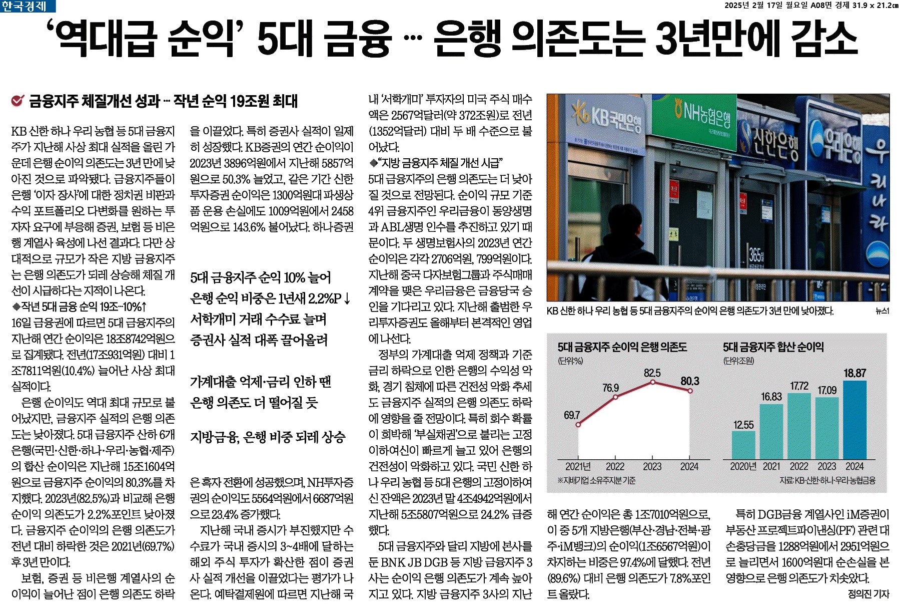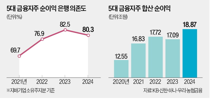 ① KB 신한 하나 우리 농협 등 5대 금융지주가 지난해 사상 최대 실적을 올린 가운데 은행 순이익 의존도는 3년 만에 낮아진 것으로 파악됐다. 금융지주들이 은행 ‘이자 장사’에 대한 정치권 비판과 수익 포트폴리오 다변화를 원하는 투자자 요구에 부응해 증권, 보험 등 비은행 계열사 육성에 나선 결과다. 다만 상대적으로 규모가 작은 지방 금융지주는 은행 의존도가 되레 상승해 체질 개선이 시급하다는 지적이 나온다.
