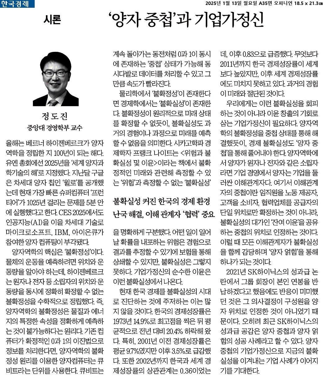 ⑤ 우리에게는 이런 불확실성을 회피하는 것이 아니라 이윤 창출의 기회로 삼는 기업가정신이 필요하다. 양자역학의 불확정성을 중첩 상태를 통해 해결했듯이, 경제 불확실성도 ‘양자 중첩’을 통해 풀어내야 한다. 양자역학에서 양자가 원자나 전자와 같은 소립자라면 기업 경영에서 양자는 기업을 둘러싼 이해관계자다. 여기서 이해관계자의 중첩이란 임직원을 노동 제공자, 고객을 소비자, 협력업체를 공급자의 단일 위치로만 확정하는 것이 아니라, 불확실성의 대가인 ‘잔여 이윤’을 공유하는 중첩의 위치로 인정하는 것이다. 이럴 때 모든 이해관계자가 불확실성을 함께 감당하며 ‘양자 얽힘’을 통해 하나가 되는 것이다.