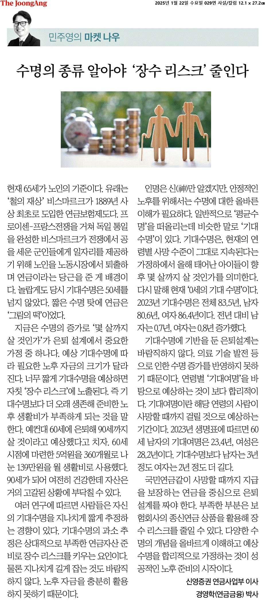 ③ 여러 연구에 따르면 사람들은 자신의 기대수명을 지나치게 짧게 추정하는 경향이 있다. 기대수명의 과소 추정은 상대적으로 부족한 연금자산 준비로 장수 리스크를 키우는 요인이다. 물론 지나치게 길게 잡는 것도 바람직하지 않다. 노후 자금을 충분히 활용하지 못하기 때문이다.