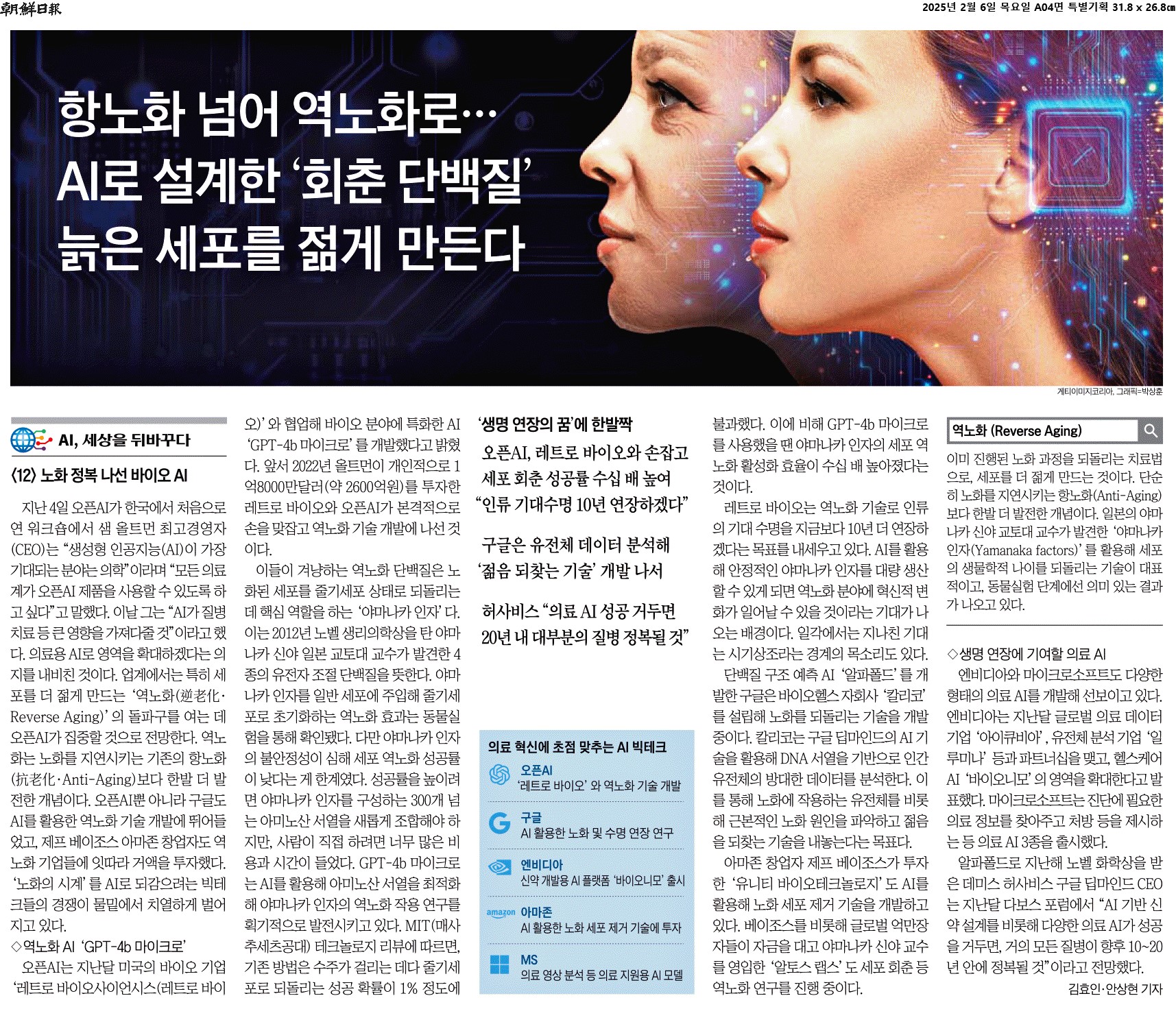 ② 업계에서는 특히 세포를 더 젊게 만드는 ‘역노화(逆老化·Reverse Aging)’의 돌파구를 여는 데 오픈AI가 집중할 것으로 전망한다. 역노화는 노화를 지연시키는 기존의 항노화(抗老化·Anti-Aging)보다 한발 더 발전한 개념이다. 오픈AI뿐 아니라 구글도 AI를 활용한 역노화 기술 개발에 뛰어들었고, 제프 베이조스 아마존 창업자도 역노화 기업들에 잇따라 거액을 투자했다. ‘노화의 시계’를 AI로 되감으려는 빅테크들의 경쟁이 물밑에서 치열하게 벌어지고 있다.
