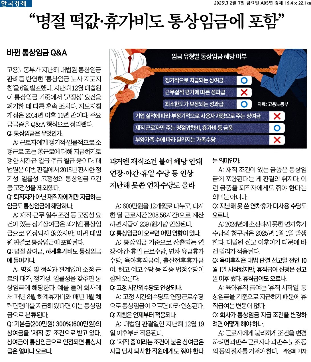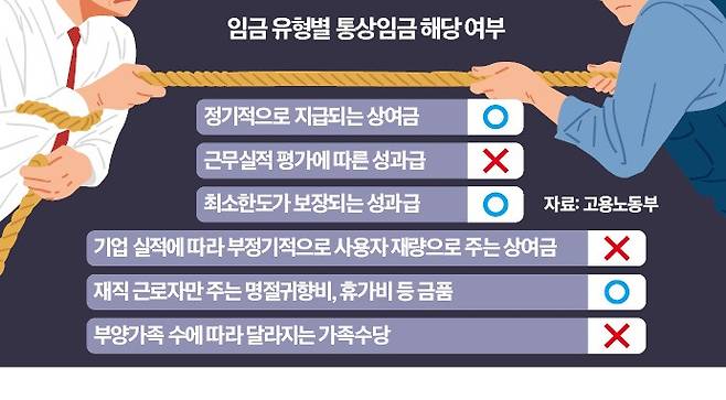 ① 고용노동부가 지난해 대법원 통상임금 판례를 반영한 ‘통상임금 노사 지도지침’을 6일 발표했다. 지난해 12월 대법원이 통상임금 기준에서 ‘고정성’ 요건을 폐기한 데 따른 후속 조치다. 지도지침 개정은 2014년 이후 11년 만이다. 주요 궁금증을 Q&A 형식으로 정리했다.
