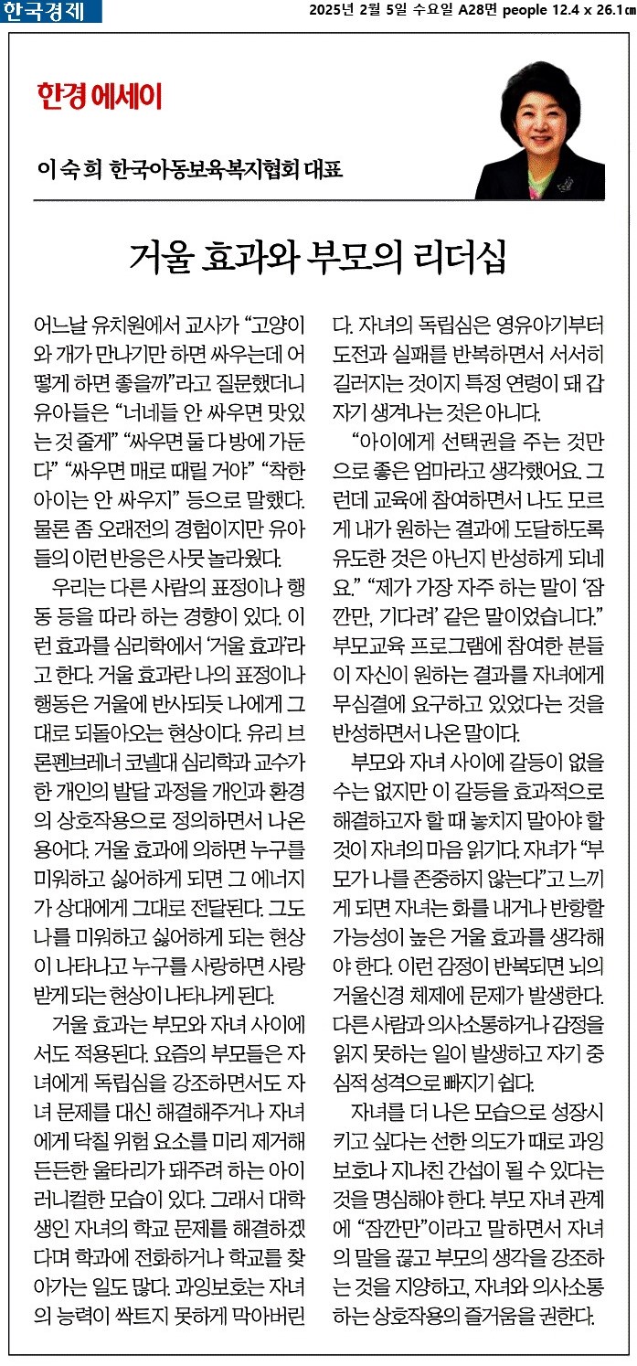 ④ 부모와 자녀 사이에 갈등이 없을 수는 없지만 이 갈등을 효과적으로 해결하고자 할 때 놓치지 말아야 할 것이 자녀의 마음 읽기다. 자녀가 “부모가 나를 존중하지 않는다”고 느끼게 되면 자녀는 화를 내거나 반항할 가능성이 높은 거울 효과를 생각해야 한다.