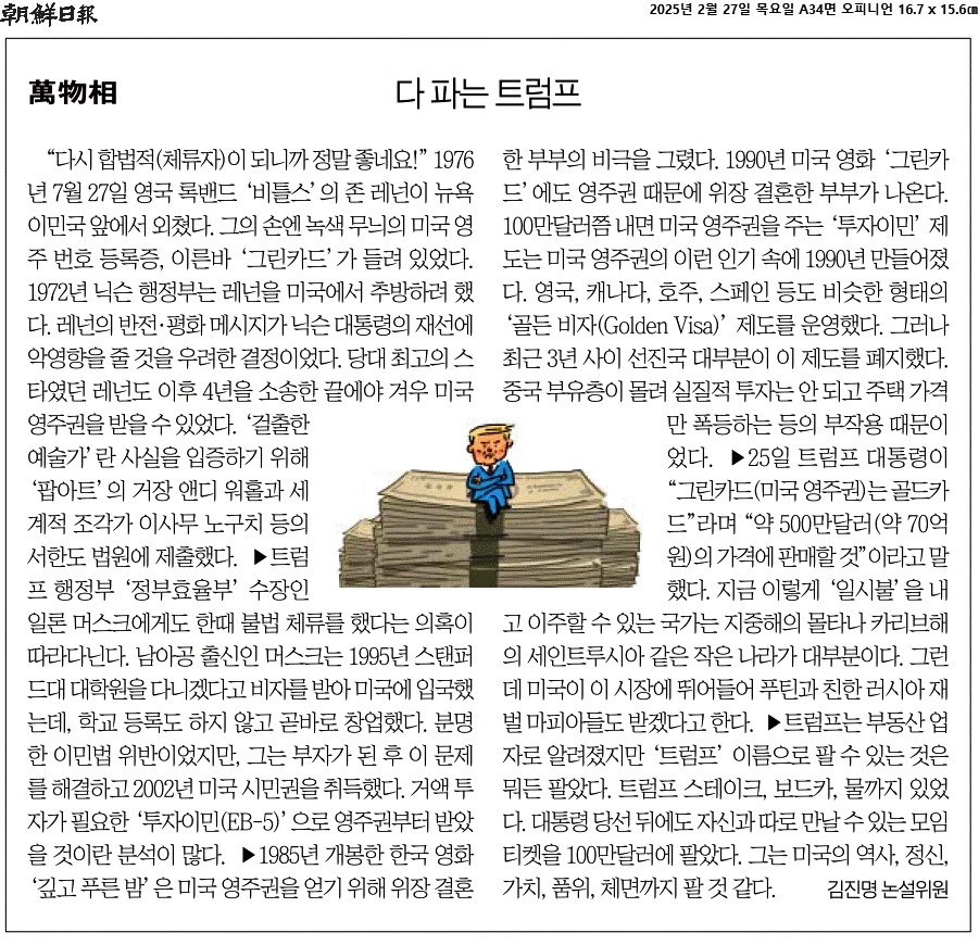 | 트럼프 "영주권 71억원에 팔겠다, 러시아 부패 재벌도 가능" (1) | 2025.02.28 |