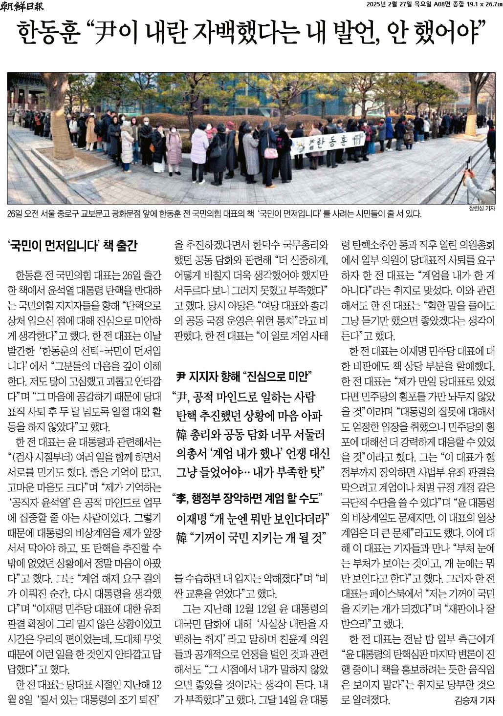 ① 한동훈 전 국민의힘 대표는 26일 출간한 책에서 윤석열 대통령 탄핵을 반대하는 국민의힘 지지자들을 향해 “탄핵으로 상처 입으신 점에 대해 진심으로 미안하게 생각한다”고 했다. 한 전 대표는 이날 발간한 ‘한동훈의 선택-국민이 먼저입니다’에서 “그분들의 마음을 깊이 이해한다.