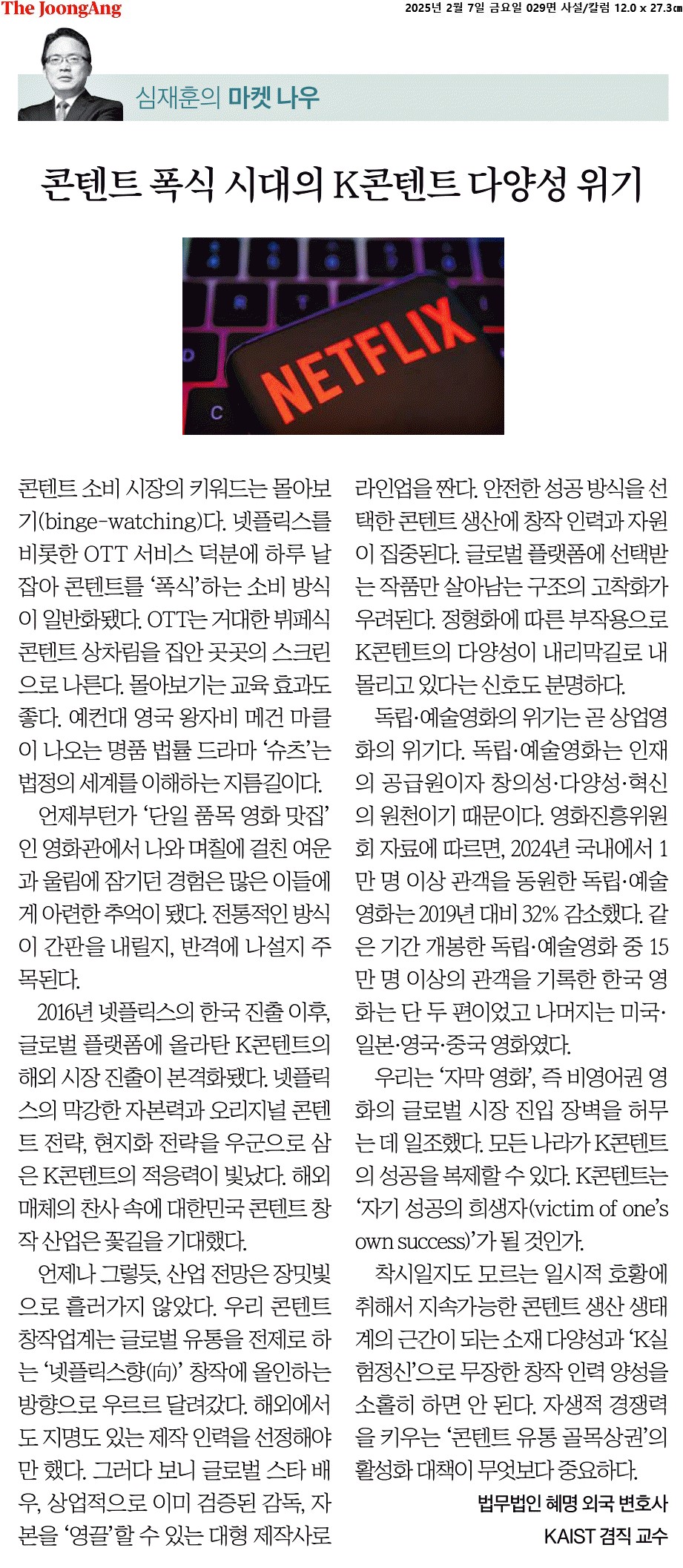 ③ 글로벌 플랫폼에 선택받는 작품만 살아남는 구조의 고착화가 우려된다. 정형화에 따른 부작용으로 K콘텐트의 다양성이 내리막길로 내몰리고 있다는 신호도 분명하다.