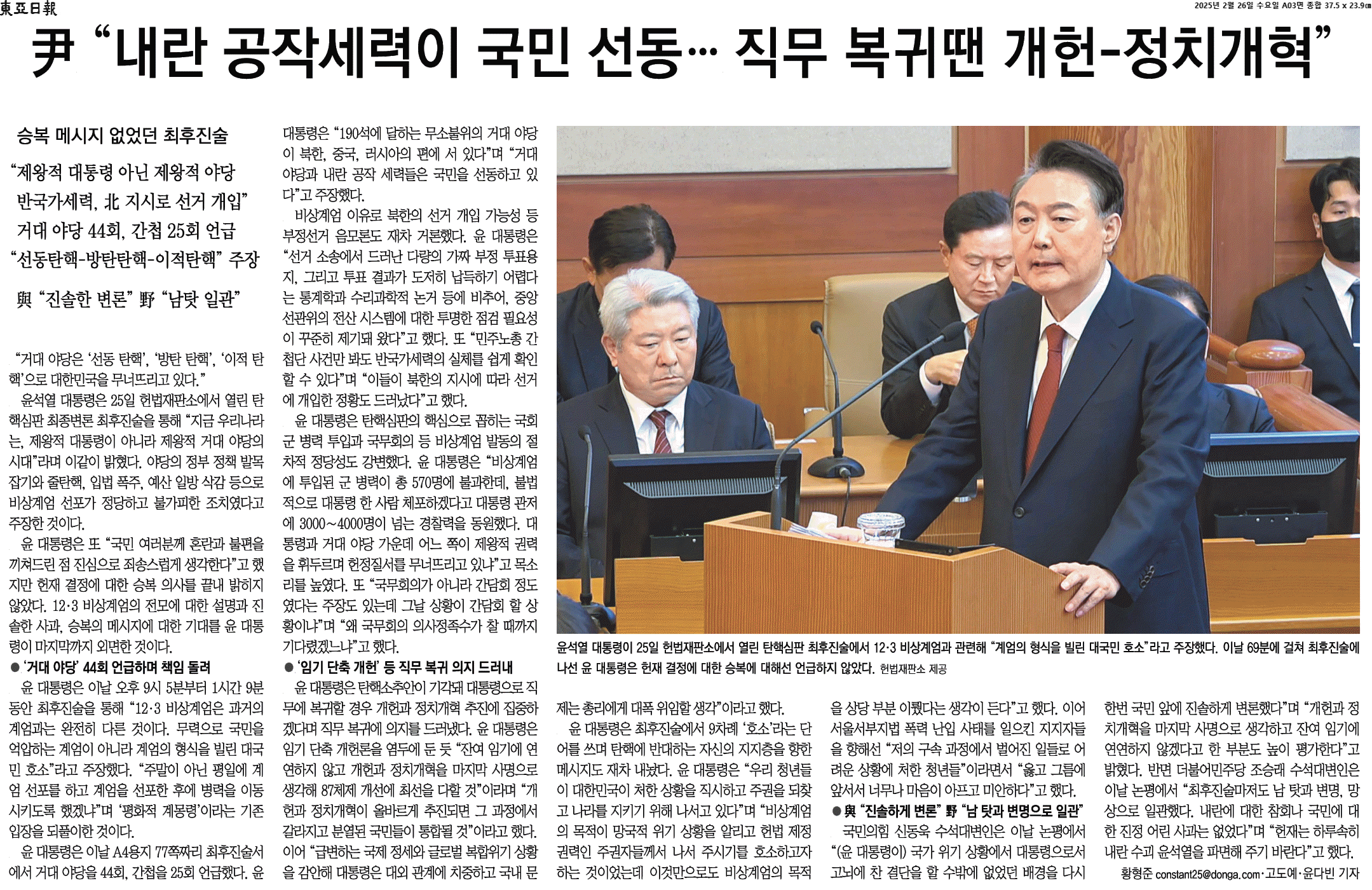 ① 윤석열 대통령은 25일 헌법재판소에서 열린 탄핵심판 최종변론 최후진술을 통해 “지금 우리나라는, 제왕적 대통령이 아니라 제왕적 거대 야당의 시대”라며 이같이 밝혔다. 야당의 정부 정책 발목 잡기와 줄탄핵, 입법 폭주, 예산 일방 삭감 등으로 비상계엄 선포가 정당하고 불가피한 조치였다고 주장한 것이다.