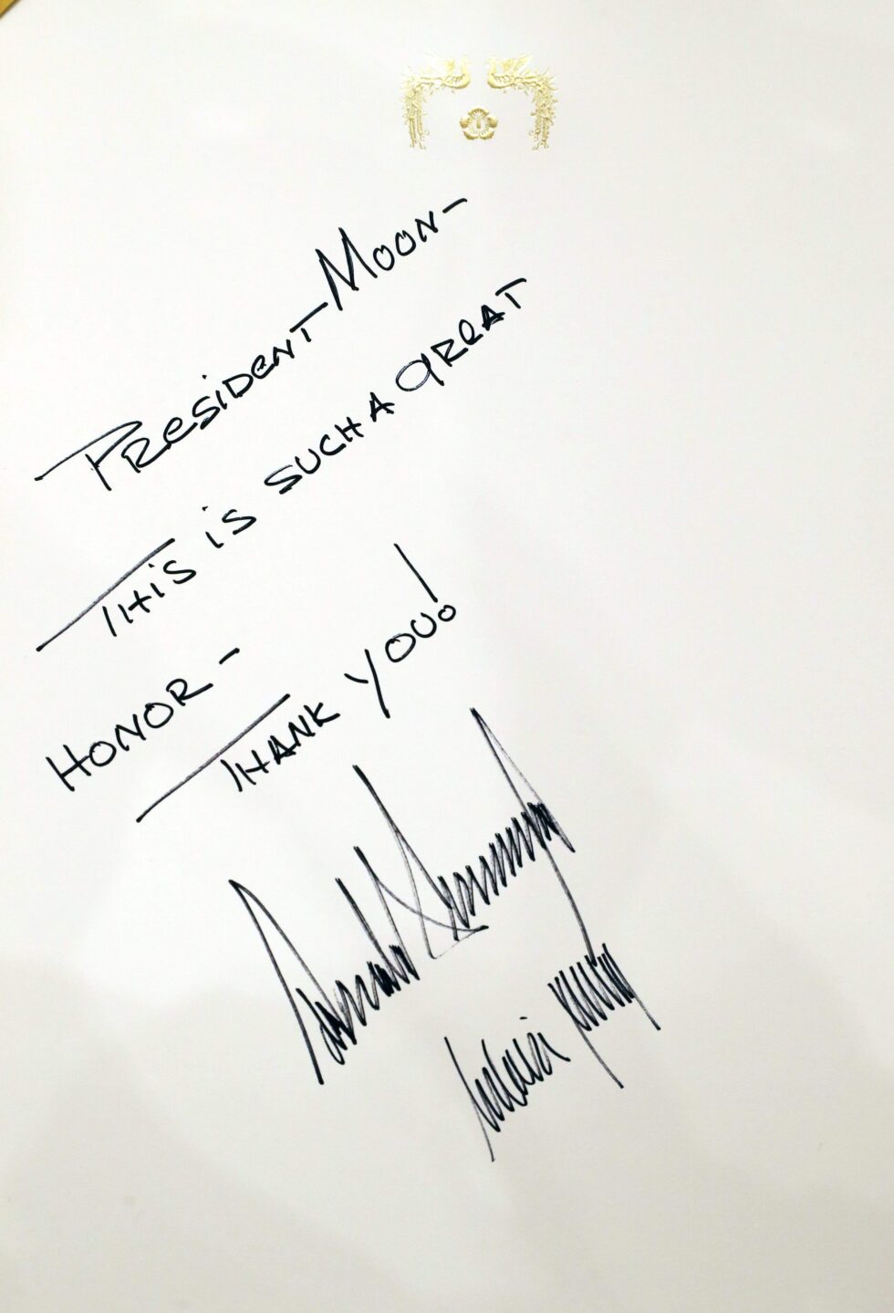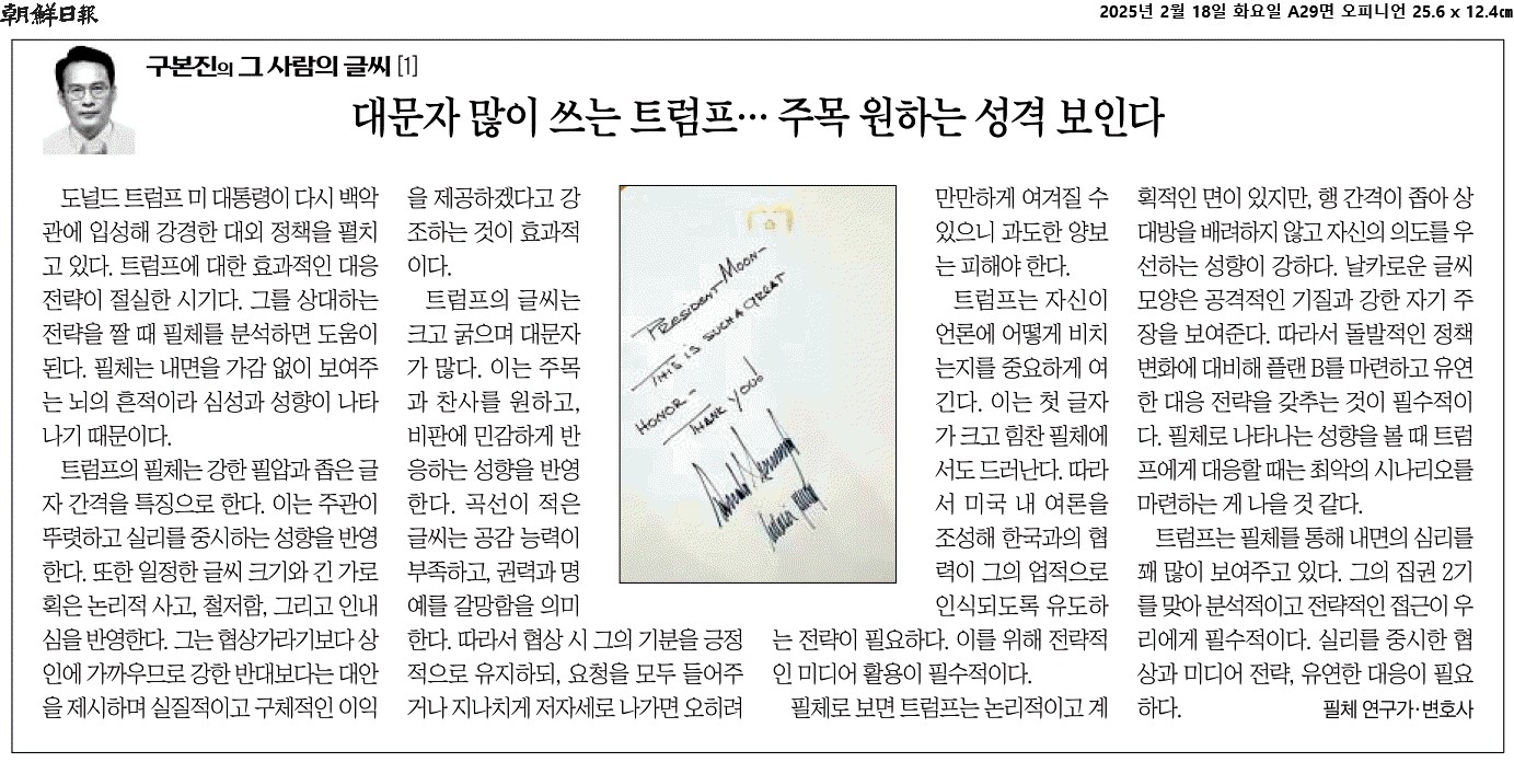 ① 도널드 트럼프 미 대통령이 다시 백악관에 입성해 강경한 대외 정책을 펼치고 있다. 트럼프에 대한 효과적인 대응 전략이 절실한 시기다. 그를 상대하는 전략을 짤 때 필체를 분석하면 도움이 된다. 필체는 내면을 가감 없이 보여주는 뇌의 흔적이라 심성과 성향이 나타나기 때문이다.