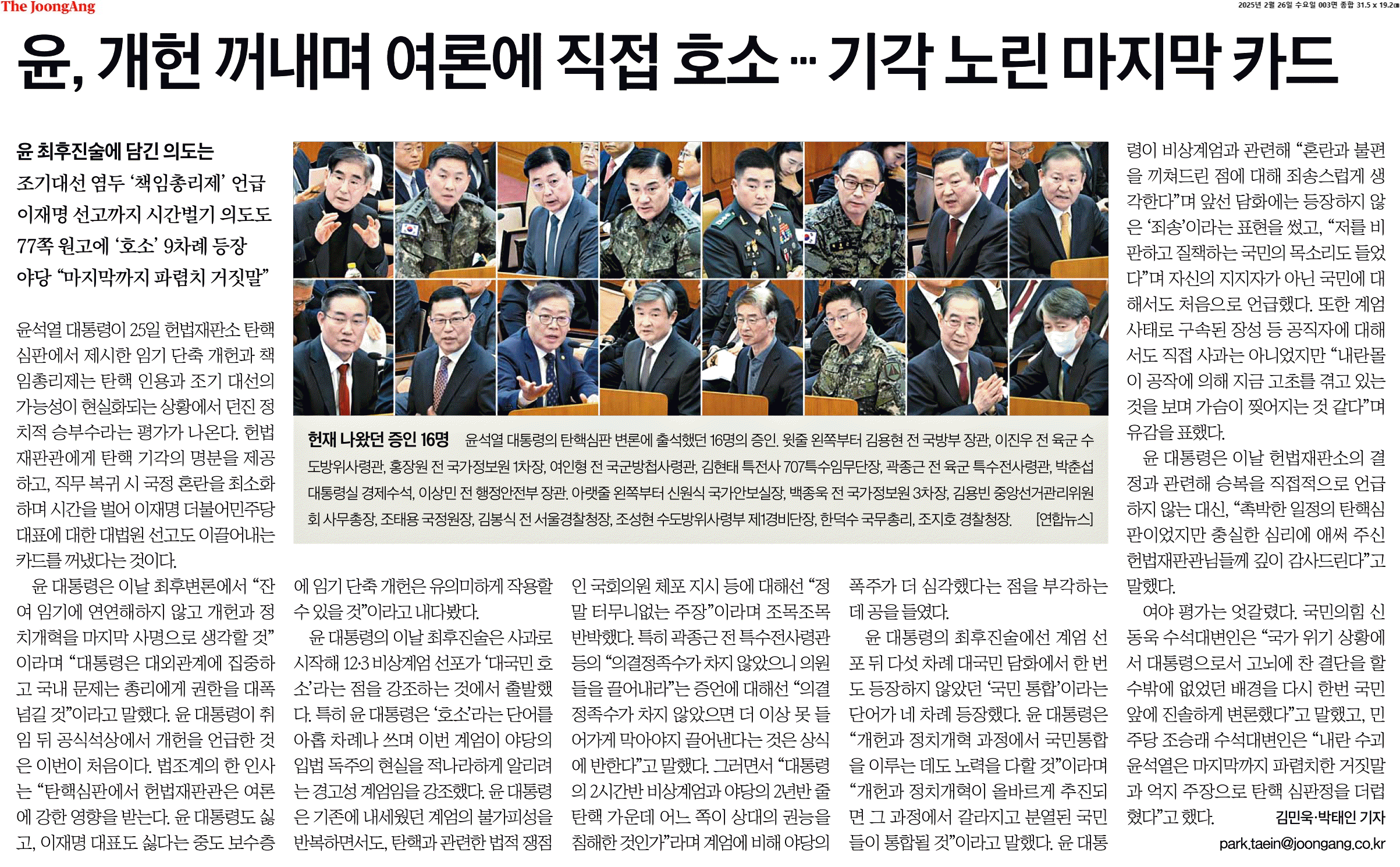 ① 윤석열 대통령이 25일 헌법재판소 탄핵심판에서 제시한 임기 단축 개헌과 책임총리제는 탄핵 인용과 조기 대선의 가능성이 현실화되는 상황에서 던진 정치적 승부수라는 평가가 나온다. 헌법재판관에게 탄핵 기각의 명분을 제공하고, 직무 복귀 시 국정 혼란을 최소화하며 시간을 벌어 이재명 더불어민주당 대표에 대한 대법원 선고도 이끌어내는 카드를 꺼냈다는 것이다.