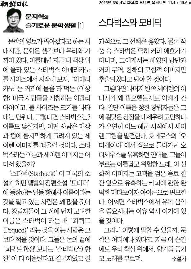② 스타벅(Starbuck)’이 미국의 소설가 허먼 멜빌의 장편소설 ‘모비딕’에 등장하는 일등 항해사 이름이라는 것을 알고 있는 사람은 꽤 많을 것이다. 창립자들이 그 전에 먼저 고려한 이름은 스타벅이 타는 배 ‘피쿼드(Pequod)’라는 것을 아는 사람은 그보다 적을 것이다. 그들은 논의 끝에 ‘피쿼드 한잔’보다는 ‘스타벅(스) 한잔’이 더 어울린다고 결론지었고 결과적으로 그 선택은 옳았다.