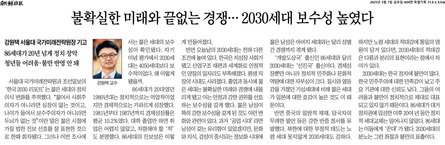 ① 서울대 국가미래전략원과 조선일보의 ‘한국 2030 리포트’는 젊은 세대의 정치 의식 변화를 추적했다. “젊어서 사회주의자가 아니라면 심장이 없는 것이고, 나이가 들어서 보수주의자가 아니라면 두뇌가 없는 것”이란 말은 젊은 시절에 가질 법한 진보 선호를 잘 표현한 것으로 한때 회자됐다. 그러나 이번 조사에서는 젊은 세대의 보수성이 확인됐다.
