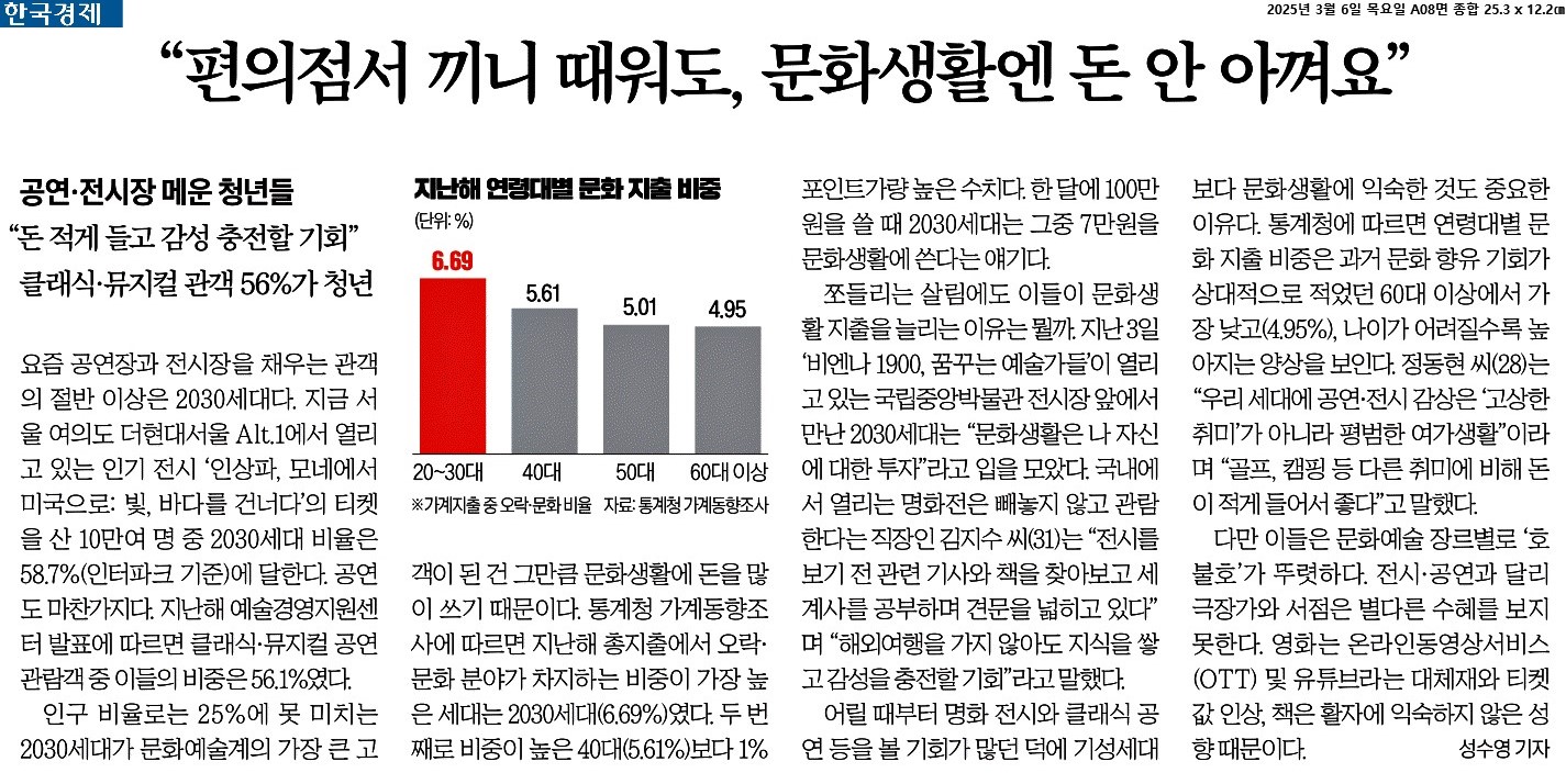 ④ 어릴 때부터 명화 전시와 클래식 공연 등을 볼 기회가 많던 덕에 기성세대보다 문화생활에 익숙한 것도 중요한 이유다. 통계청에 따르면 연령대별 문화 지출 비중은 과거 문화 향유 기회가 상대적으로 적었던 60대 이상에서 가장 낮고(4.95%), 나이가 어려질수록 높아지는 양상을 보인다.