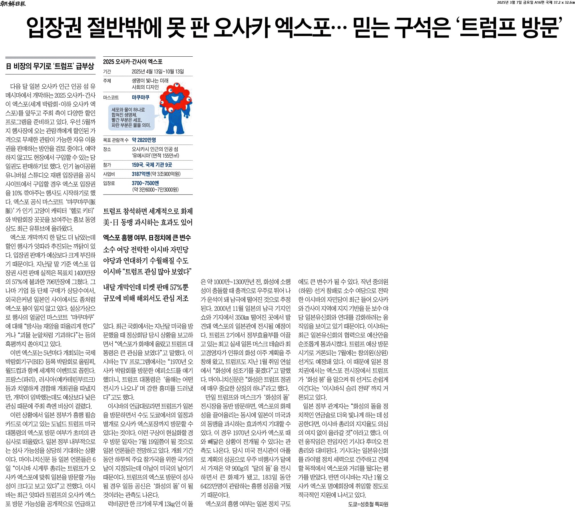 ③ 이런 상황에서 일본 정부가 흥행 필승 카드로 여기고 있는 도널드 트럼프 미국 대통령의 엑스포 방문 여부가 초미의 관심사로 떠올랐다. 일본 정부 내부적으로는 성사 가능성을 상당히 기대하는 상황이다. 마이니치신문 등 일본 언론들은 6일 “이시바 시게루 총리는 트럼프가 오사카 엑스포에 맞춰 일본을 방문할 가능성이 크다고 보고 있다”고 전했다. 이시바는 최근 잇따라 트럼프의 오사카 엑스포 방문 가능성을 공개적으로 언급하고 있다.