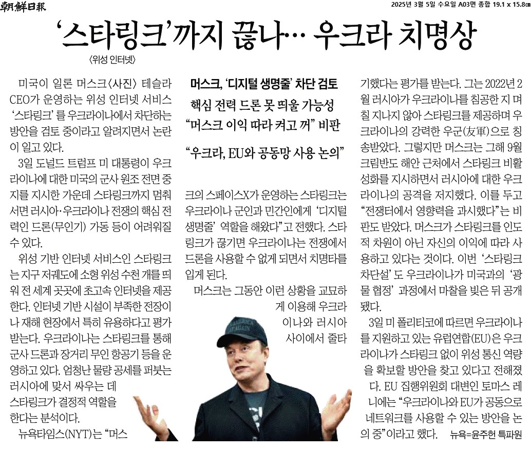 ① 미국이 일론 머스크 테슬라 CEO가 운영하는 위성 인터넷 서비스 ‘스타링크’를 우크라이나에서 차단하는 방안을 검토 중이라고 알려지면서 논란이 일고 있다. 3일 도널드 트럼프 미 대통령이 우크라이나에 대한 미국의 군사 원조 전면 중지를 지시한 가운데 스타링크까지 멈춰 서면 러시아·우크라이나 전쟁의 핵심 전력인 드론(무인기) 가동 등이 어려워질 수 있다.